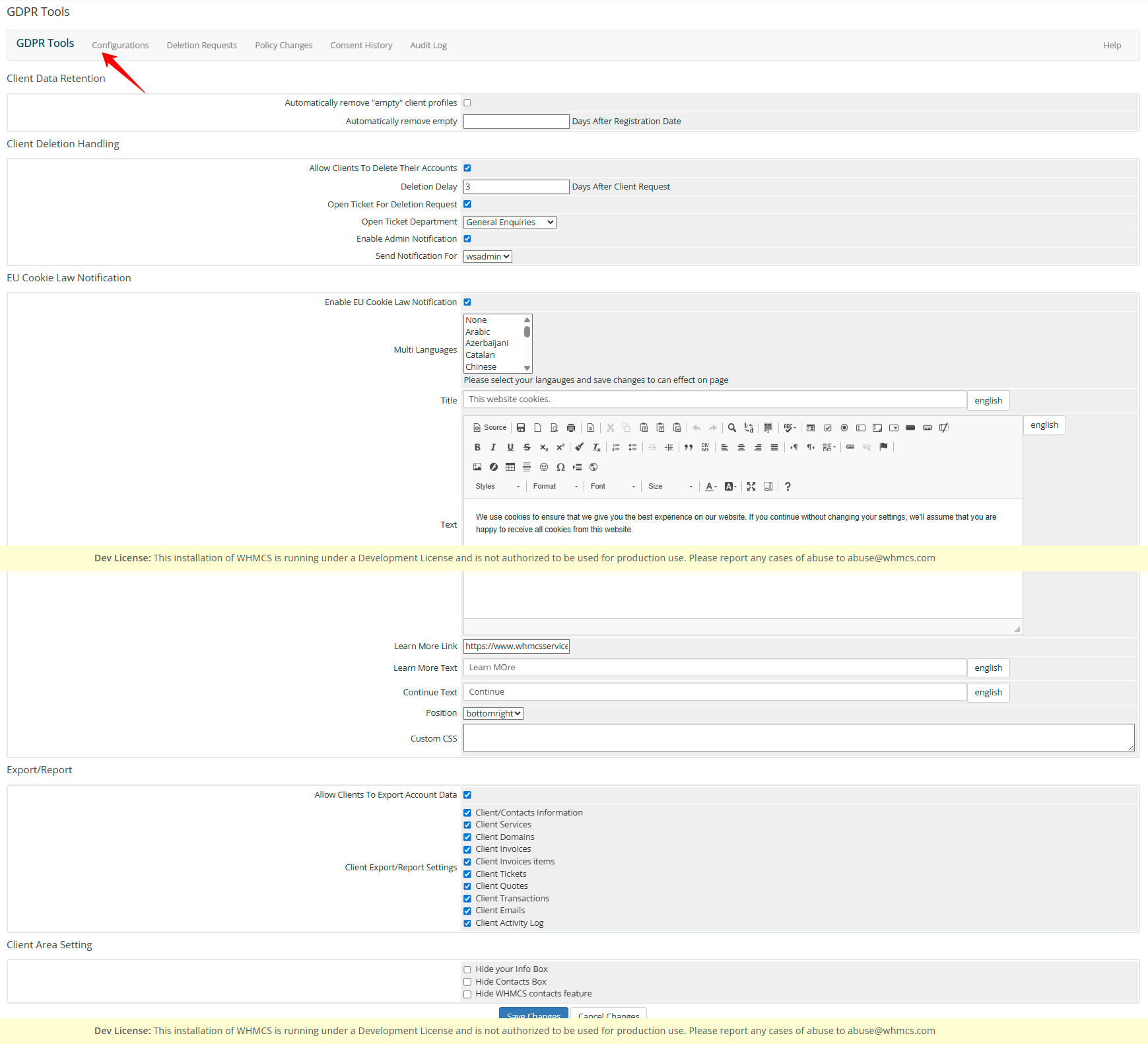 The module have problem on the documentation menu of WHMCS, you can't display the menu if you have active the module GDPR Tools and the support is very bad. Very disappointed.