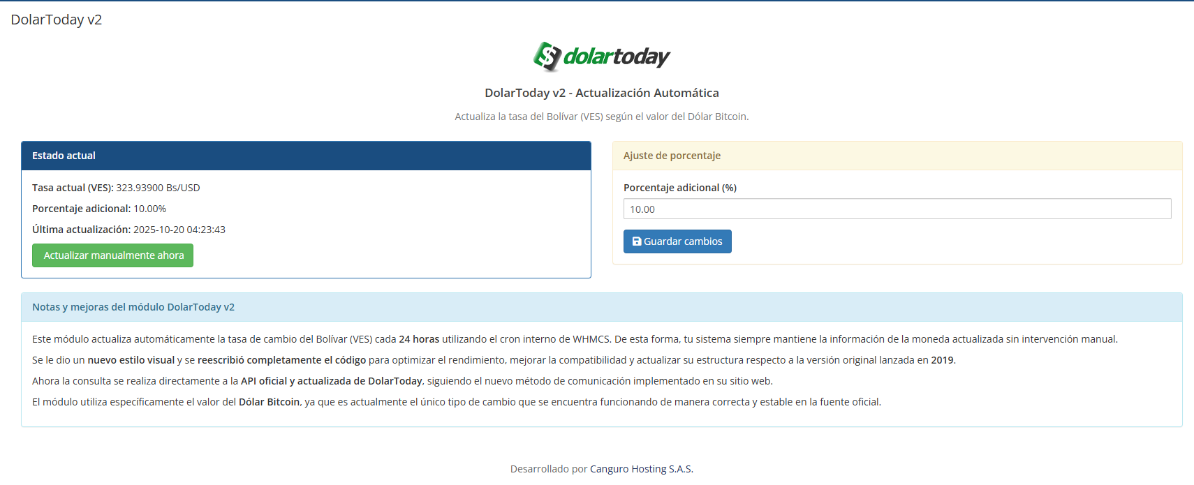 The DolarToday v2 Addon automatically updates the VES currency in your WHMCS using the latest Dólar Bitcoin rate from the official DolarToday API.