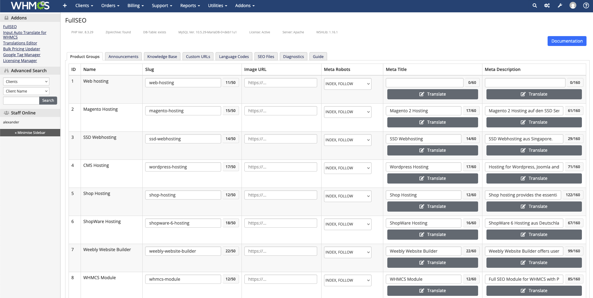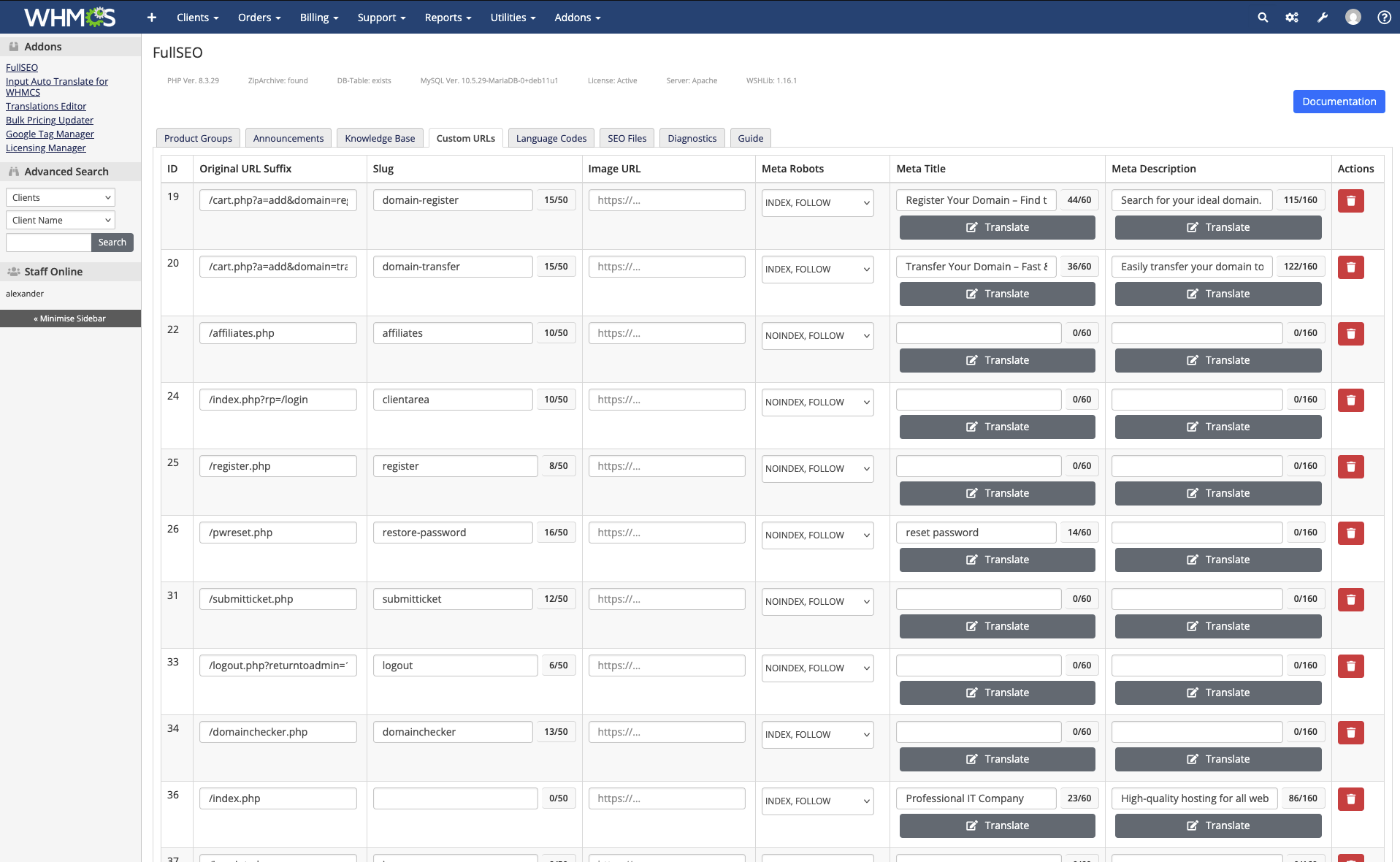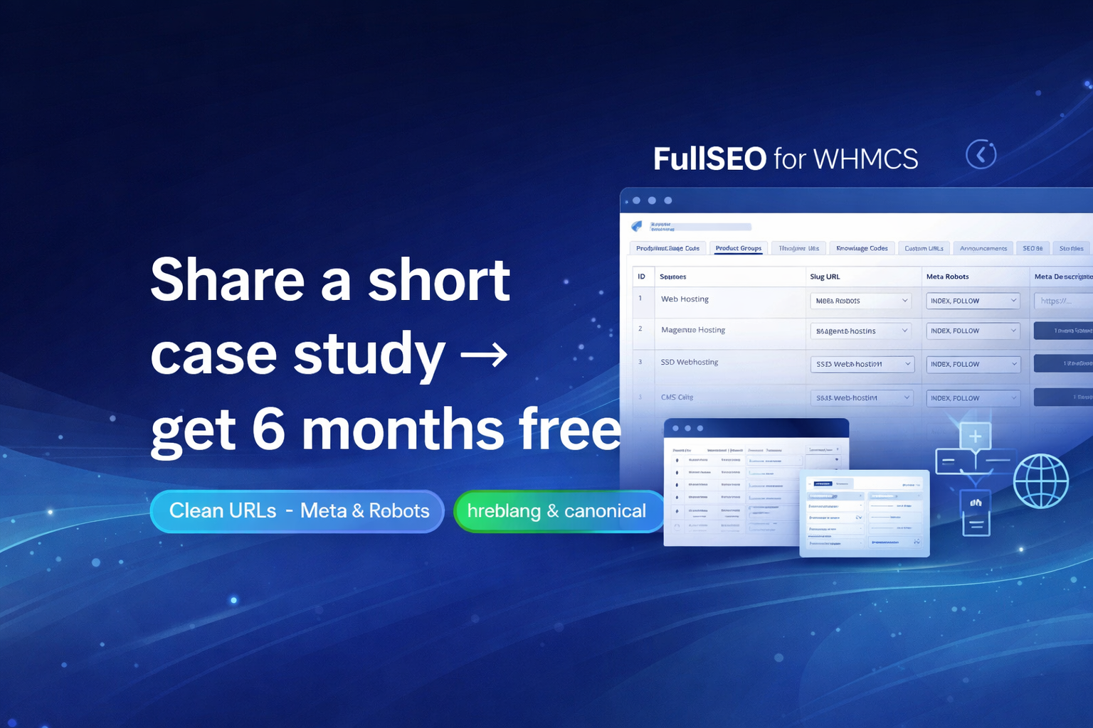 Manage clean URLs, meta titles/descriptions, indexing rules, canonical, hreflang, sitemap.xml and robots.txt directly in your WHMCS admin panel — and keep full control as your content grows.