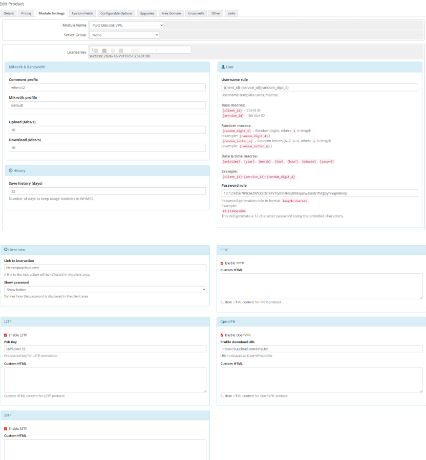 After installation, the module will fully manage the creation, edition, and suspension of VPN accounts and interact with the WHMCS billing system, exchanging data needed for settlements with customers, activations or service blocking.