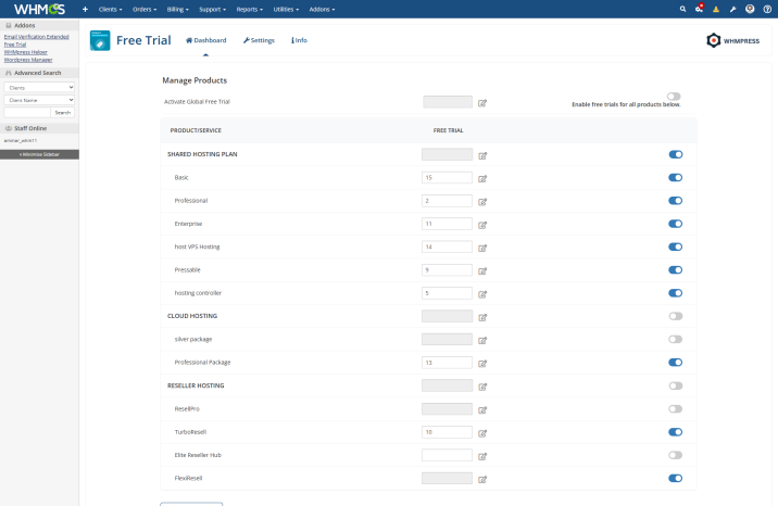 Product Free Trial Manager for WHMCS is a powerful and flexible module that enables you to offer trial access to your products and services, allowing clients to place orders without immediate payment and evaluate the offering for a specified trial period. With this module, you have full control over the duration of the trial period, the number of trial products that can be added to the cart. To prevent abuse, you can limit free trials to new customers only, ensuring that returning users cannot immediately restart a trial after their previous one has ended. WHMPRESS Product Free Trial Manager For WHMCS is an alternative to Product Free Trial Manager For WHMCS By Modules Garden.