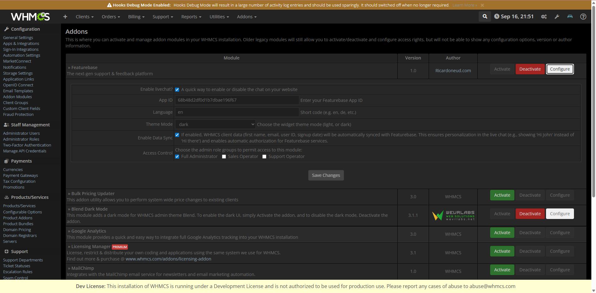 Easily integrate Featurebase Livechat into your WHMCS installation with this lightweight, user-friendly, and highly configurable addon. Designed for SaaS companies and service providers, this module allows you to bring modern support, feedback, and customer engagement tools directly into your client portal.