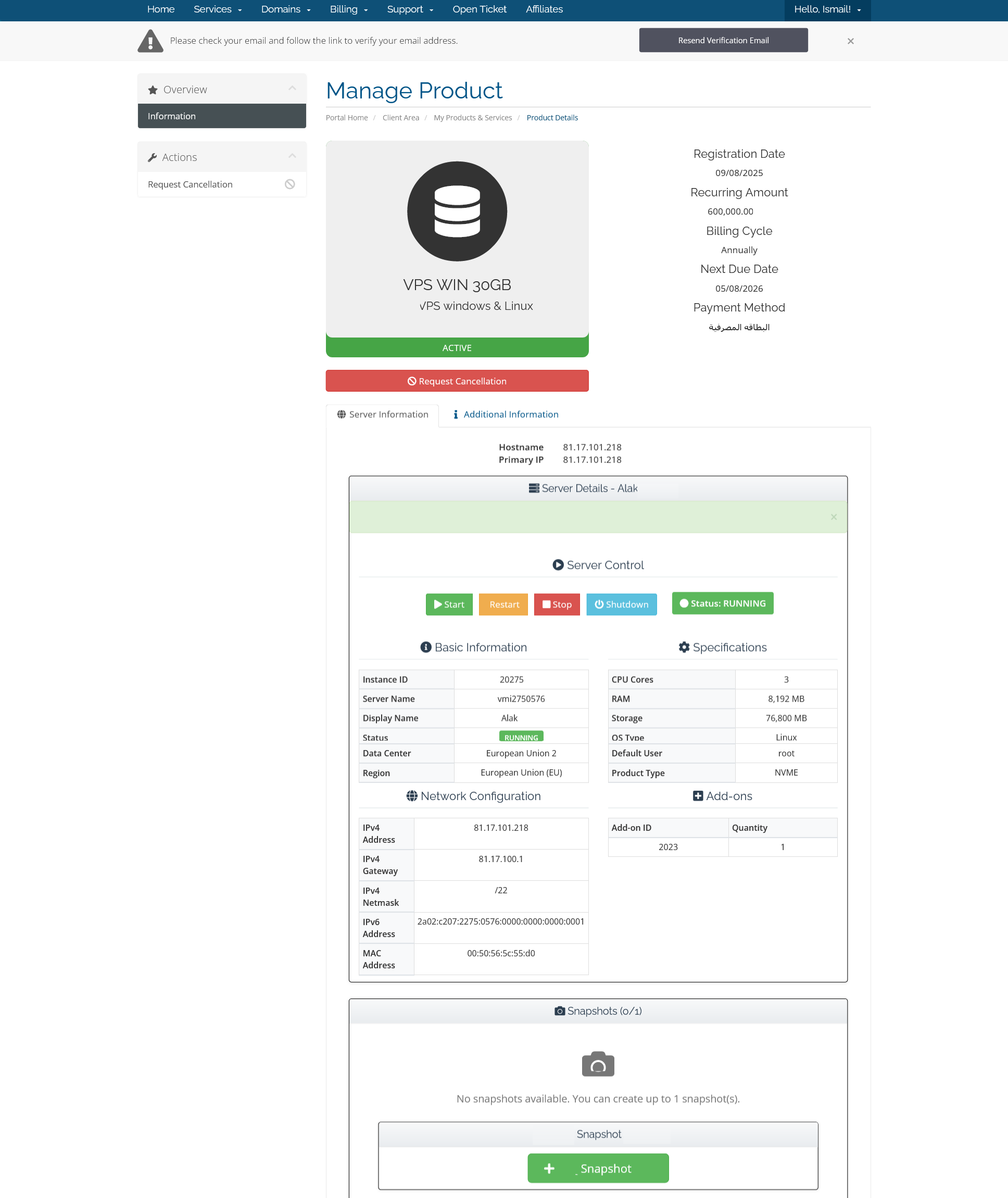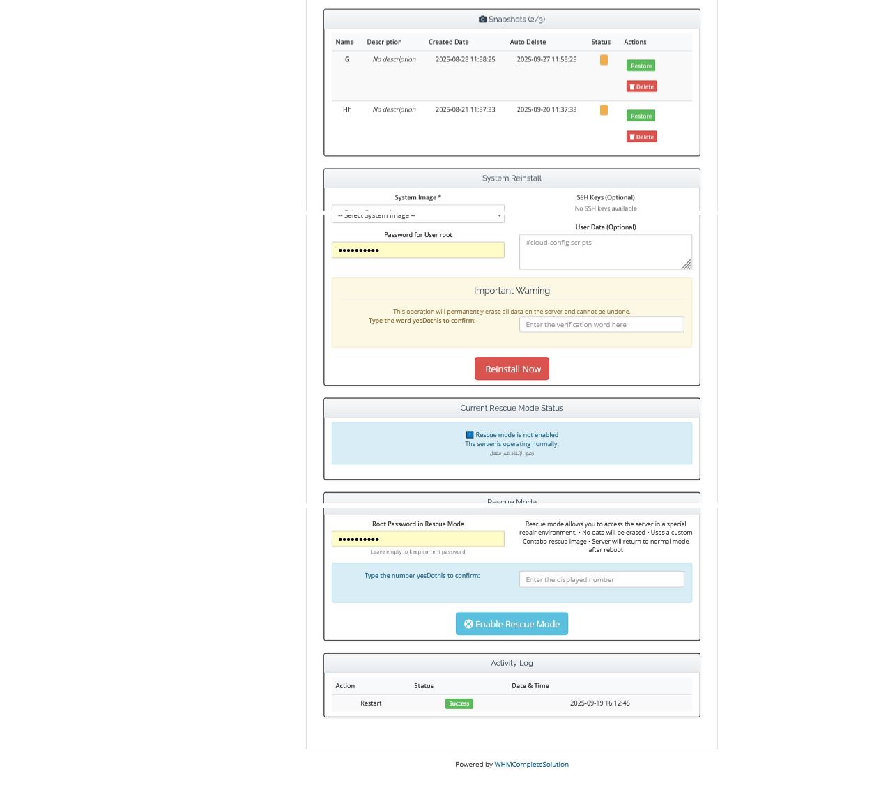 تشغيل/إيقاف/إعادة تشغيل الخادم. عرض حالة الخادم / تفاصيله / معلومات الشبكة. عرض، إنشاء، حذف واستعادة اللقطات (Snapshots) للباقات VPS فقط. إعادة تثبيت الخادم مع اختيار نظام التشغيل المطلوب. عرض المهام / سجل الأنشطة.