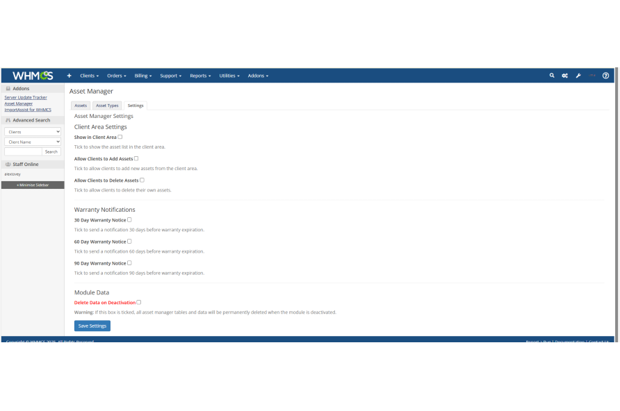 You are in full control. Enable the client area, allow clients to add/delete assets, and configure warranty notifications with simple checkboxes.
