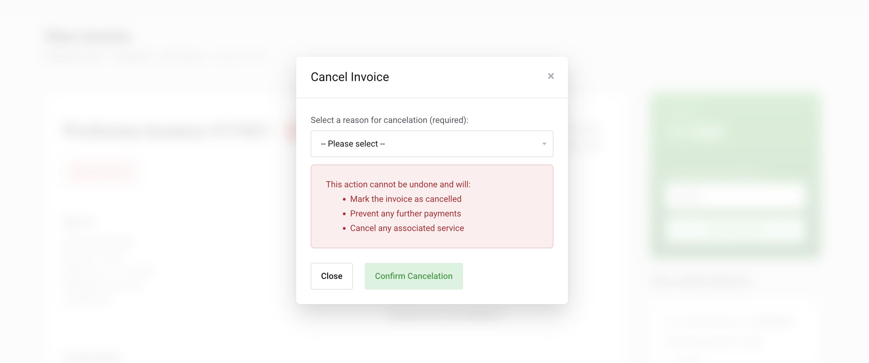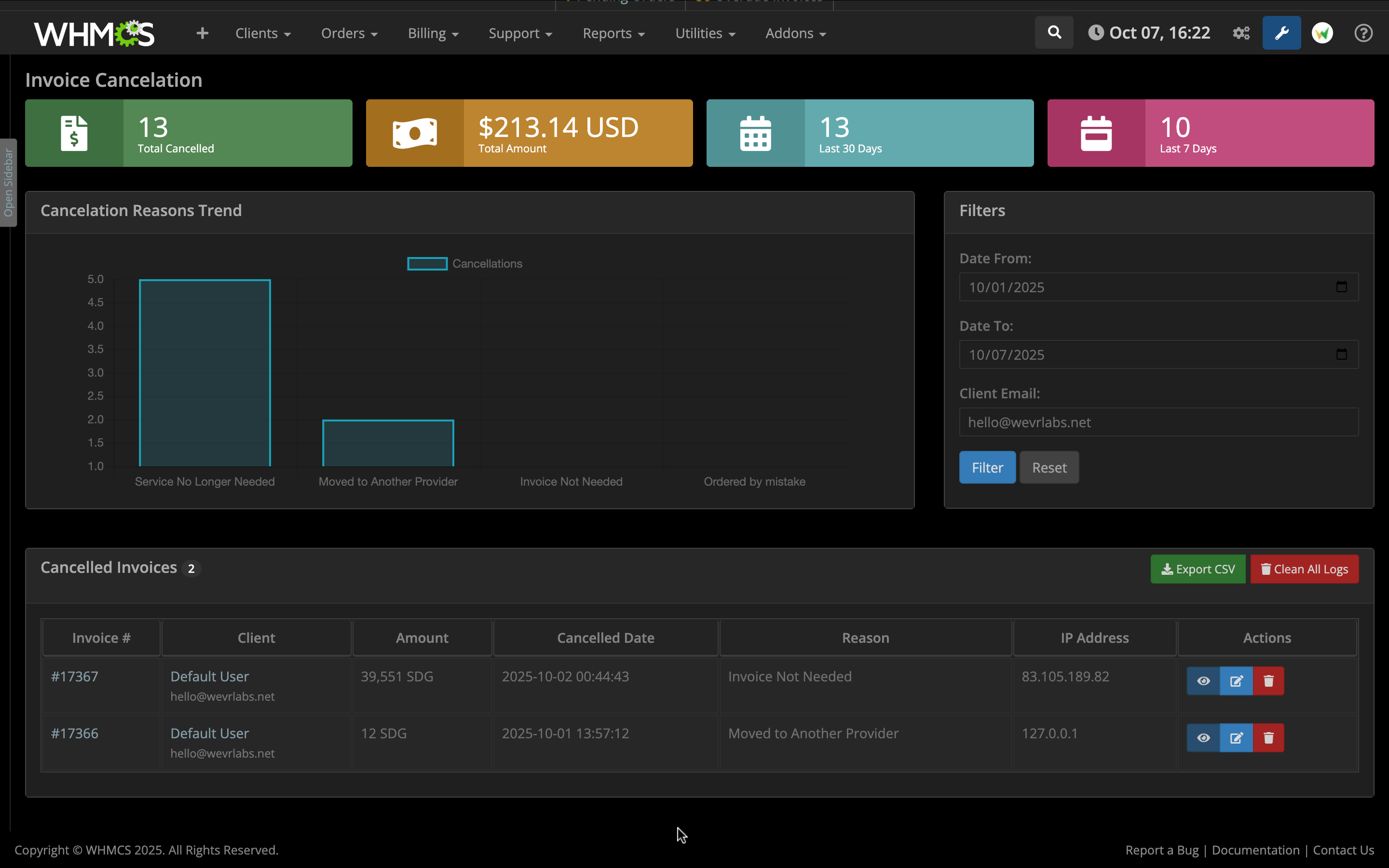 Give clients a self-serve way to cancel unpaid invoices while you stay in control. The Invoice Cancelation addon for WHMCS inserts a “Cancel Invoice” button in the invoice page in the client area, logs every action for review, and gives your staff the tools to understand why customers cancel before the invoice ever hits your help desk.