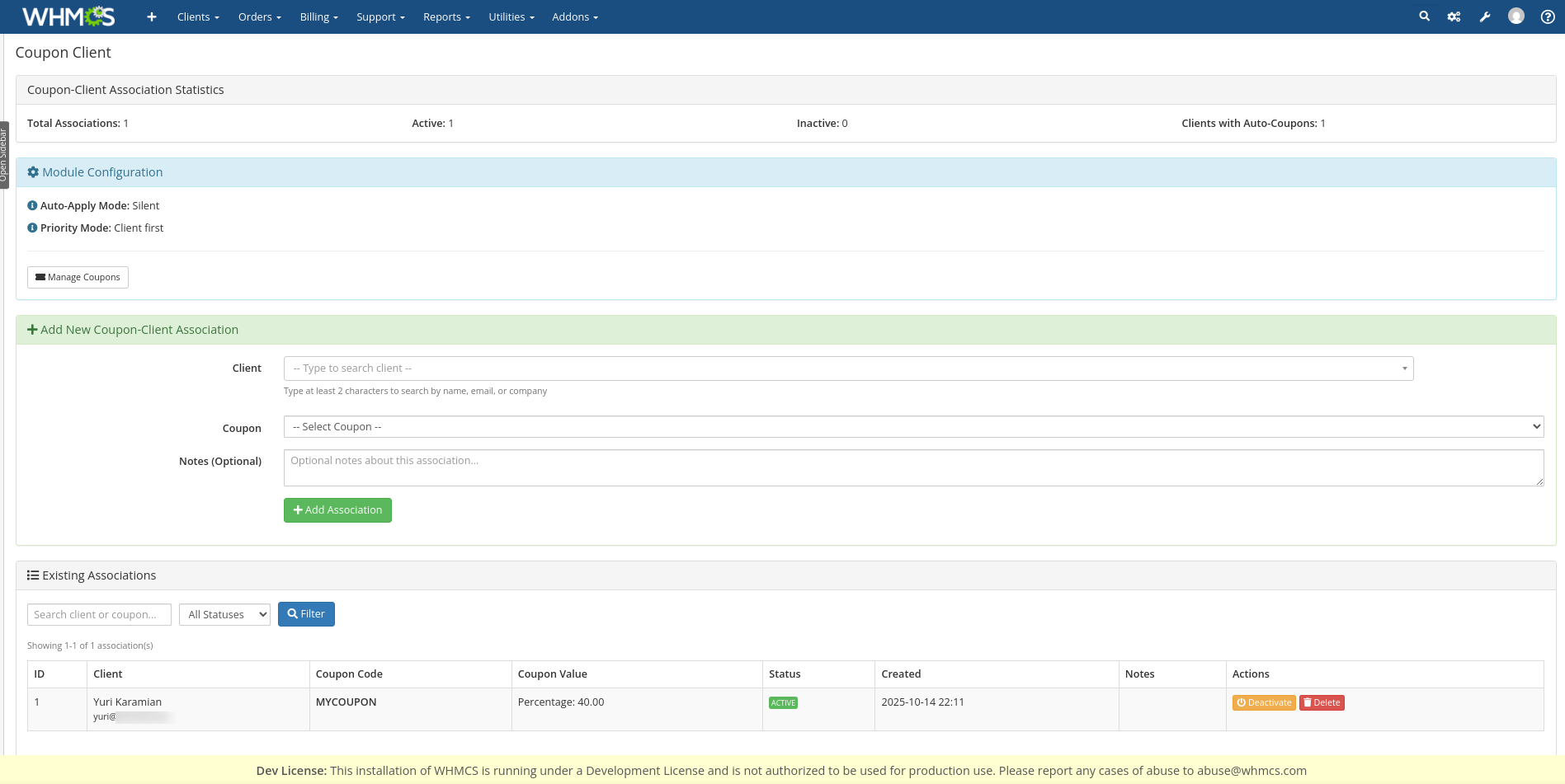 : Manual entry winsOne active coupon per client. Create multiple associations but only activate one.