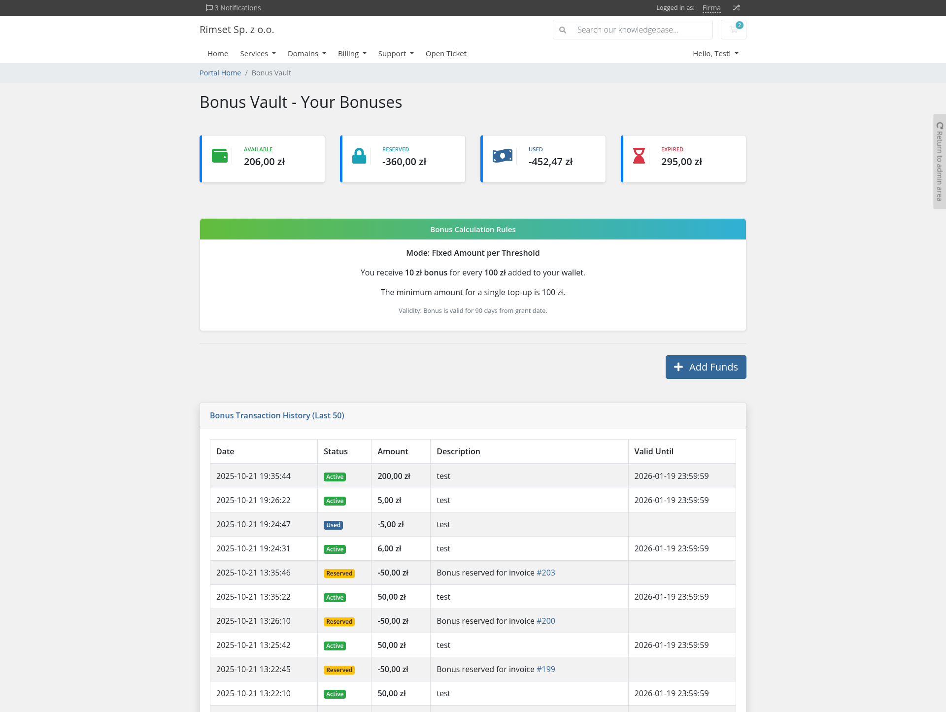 Incentives on "Add Funds" Page: The module clearly displays the current bonus rules on the deposit page, encouraging clients to top-up their accounts.