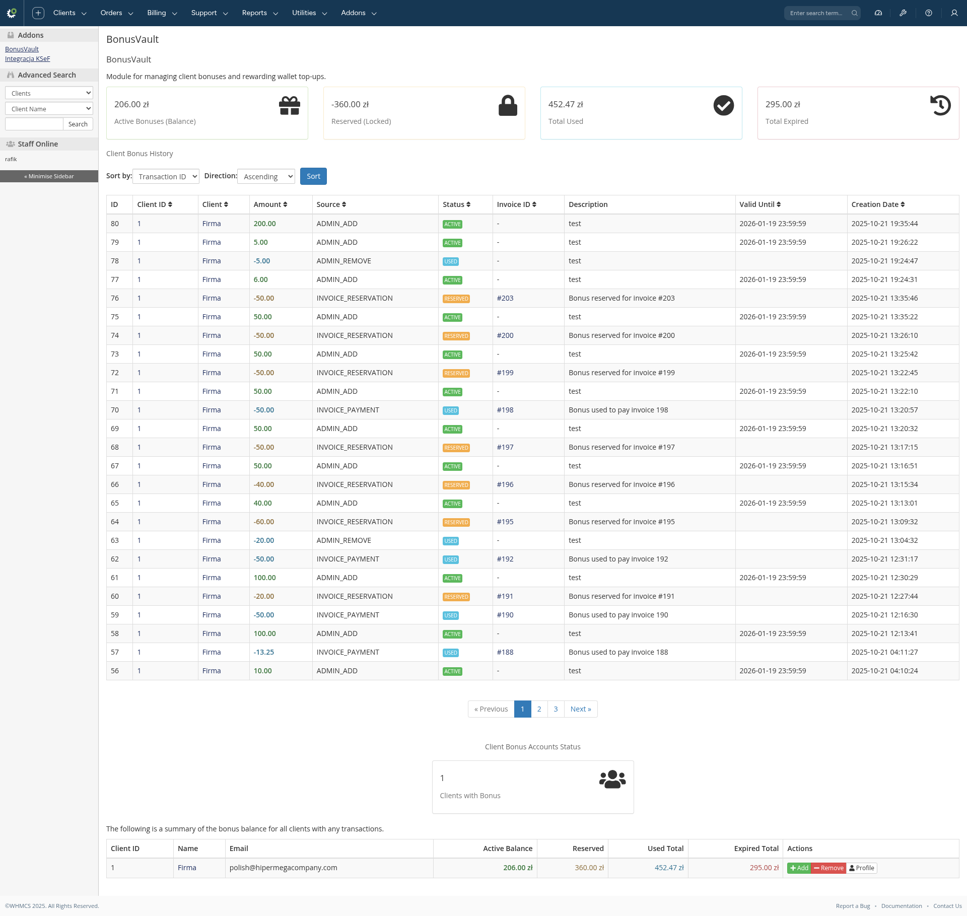 Detailed History & Balances: Browse a complete transaction history and a list of all client bonus balances, both with full pagination for improved performance.