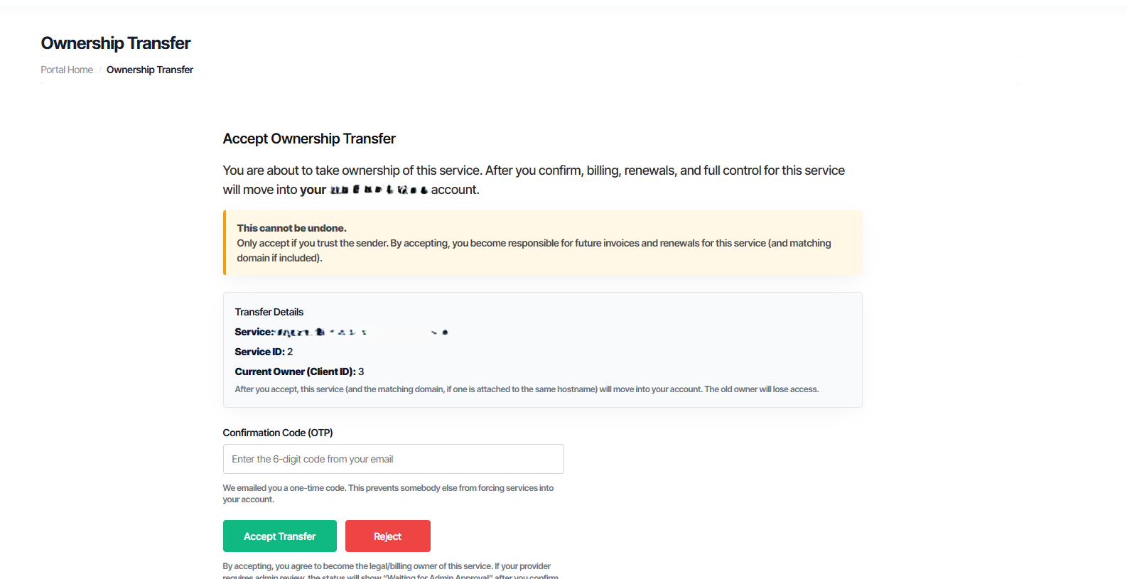 “Ownership Transfer” link injected directly into the service sidebar.