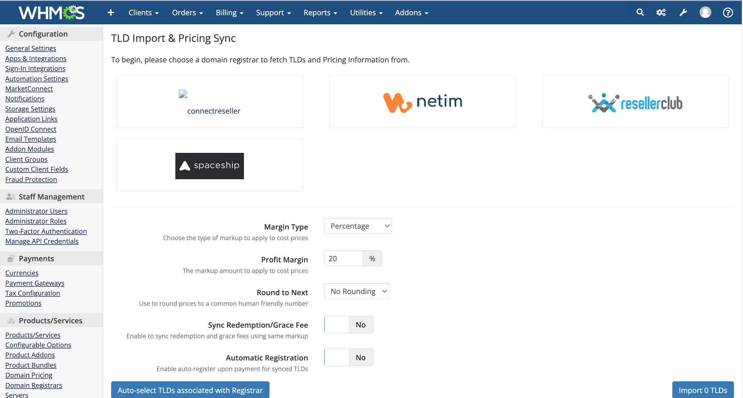 | TLD Pricing Import | Supported with Profit Margin (%) |