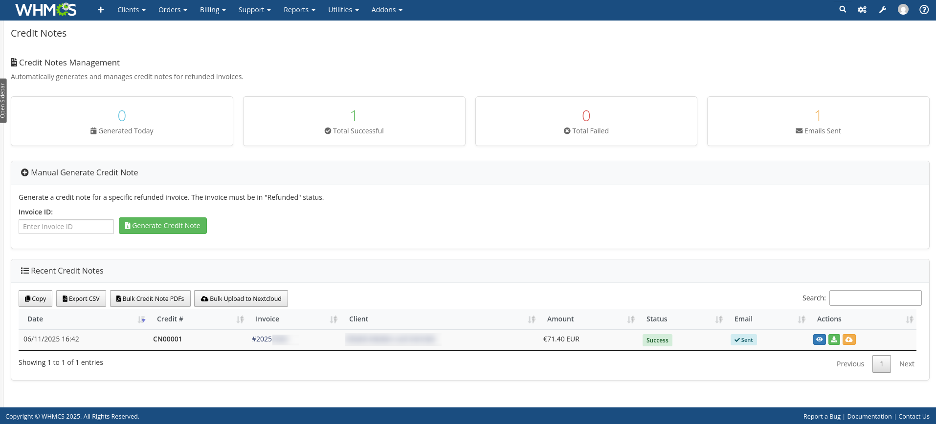 Invoice gets refunded → Credit note auto-generated → PDF created → Client can view/download → Optional Nextcloud upload