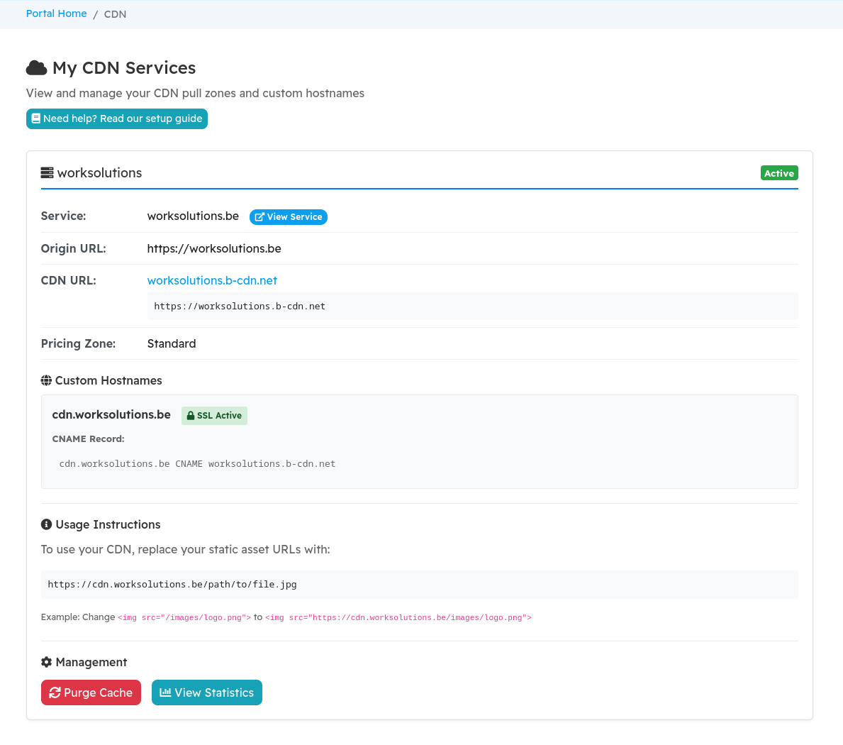 Pull zones and storage zones created automatically on order. Custom hostnames, SSL certificates, and zone settings configurable per product.