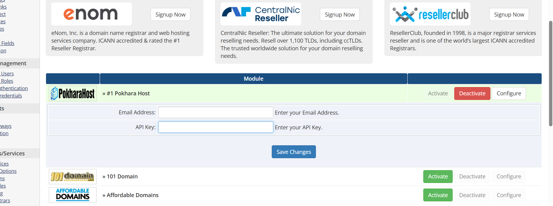 Setup → Products/Services → Domain Registrars → Pokhara Host