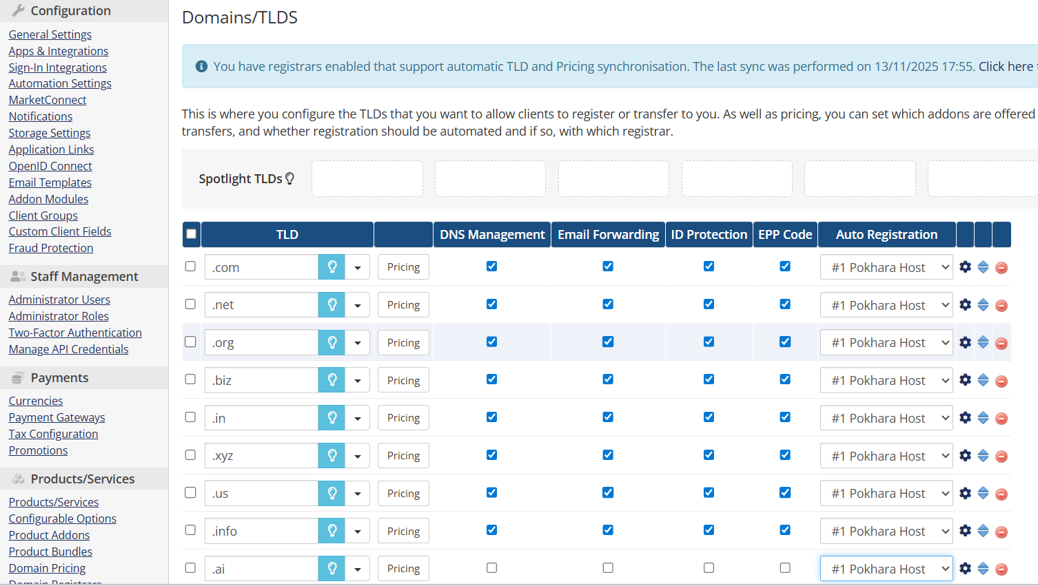 The ** Pokhara Host WHMCS Module ** is built to simplify and automate every aspect of domain reselling within the WHMCS environment. By integrating your Pokhara Host account with WHMCS, you can offer a complete domain management experience to your customers. From domain registration to renewing and transferring, managing DNS, checking availability, handling contacts, and more — everything can be controlled directly inside WHMCS.