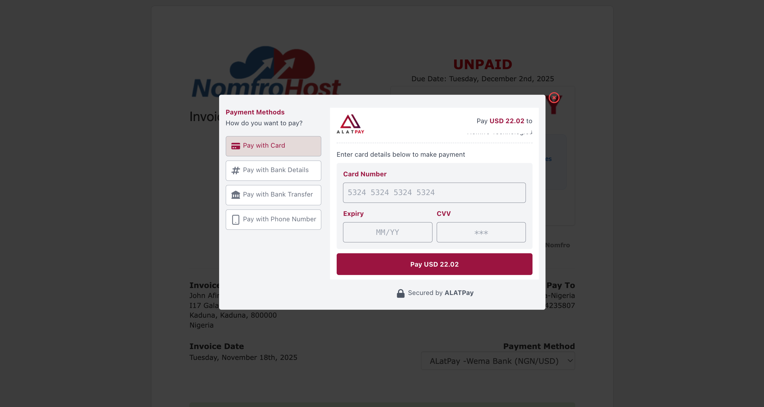 Accept payments seamlessly with ALatPay by Wema Bank – Nigeria’s modern digital payment gateway. Features beautiful inline popup (no redirects), instant invoice marking as Paid, NGN & USD support, pass transaction fees, duplicate protection, and backup webhook. Built with the same reliability as the top Nigerian gateways. Perfect for hosting companies, freelancers, and e-commerce businesses.