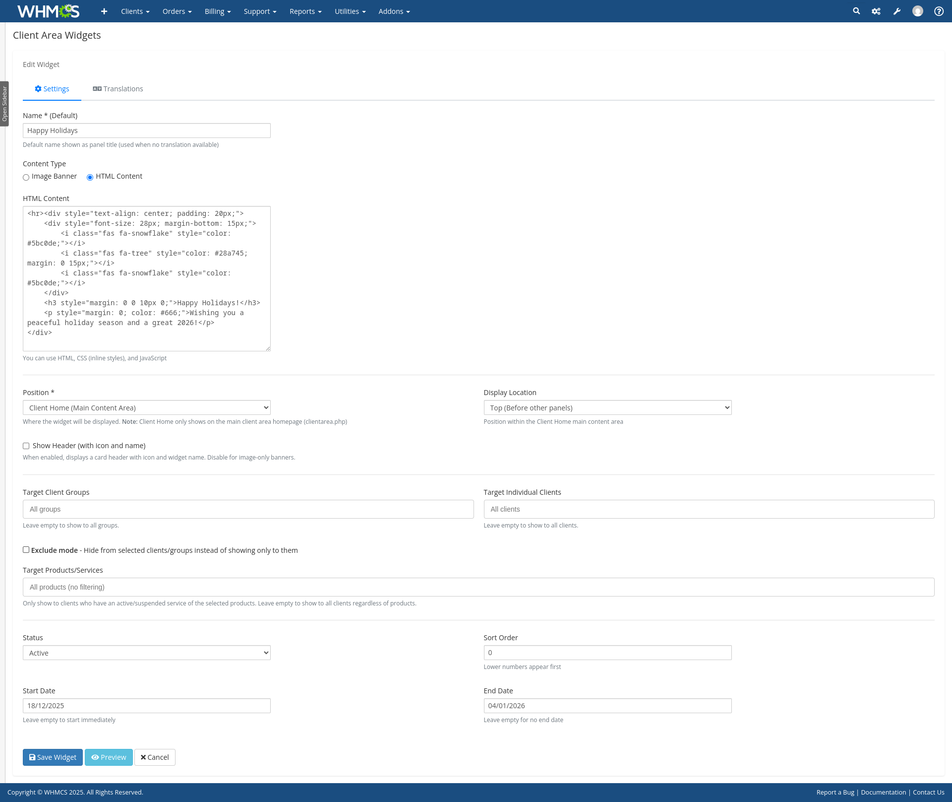 Addon module for displaying custom content in your WHMCS client area.