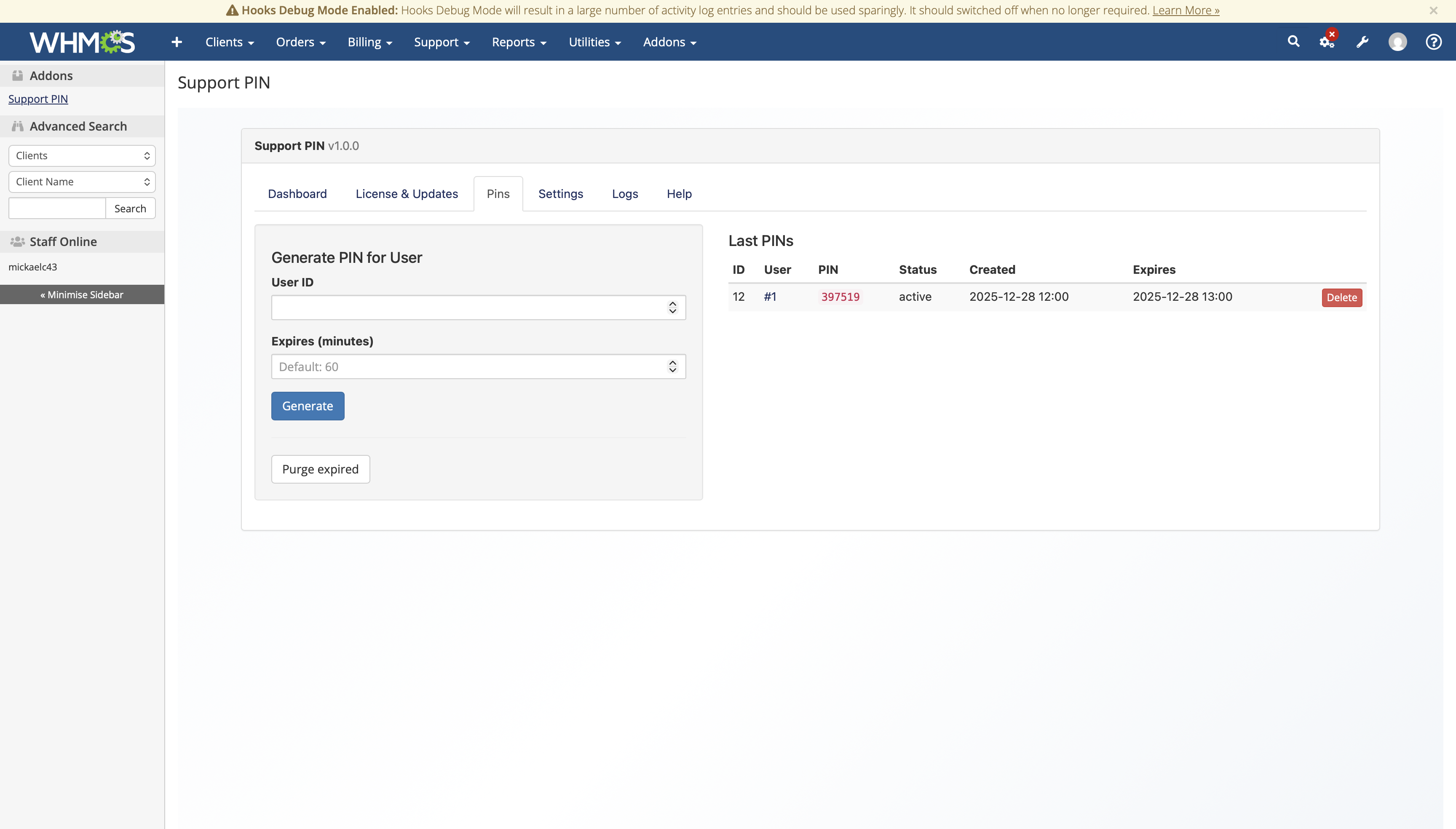 Support PIN adds an additional layer of security to your WHMCS support workflow by allowing clients to generate temporary PIN codes used to verify their identity during support interactions.