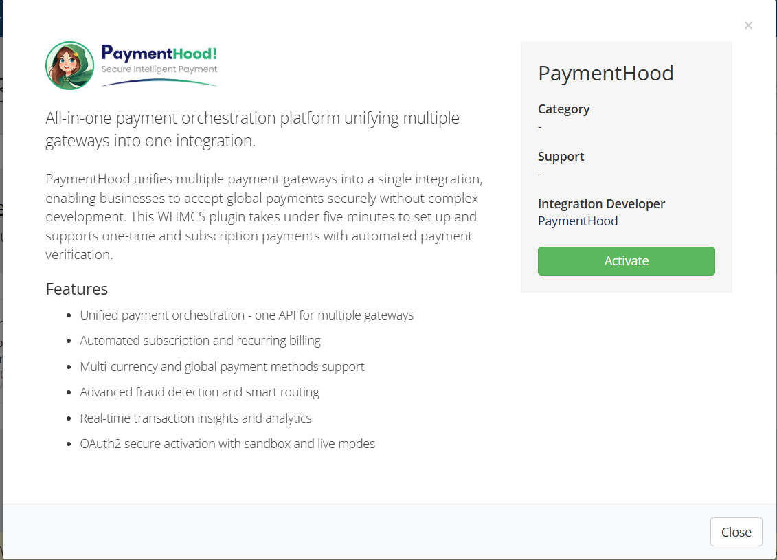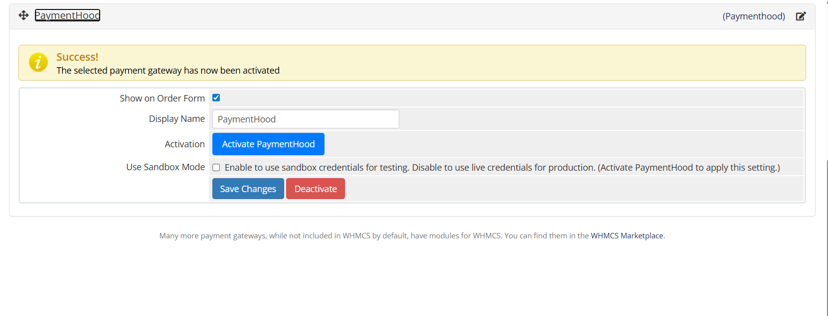 This module adds PaymentHood as a payment gateway in WHMCS. Customers can select PaymentHood during checkout and complete their payment using a secure hosted checkout page. After payment confirmation, WHMCS automatically records the transaction and updates the corresponding invoice.