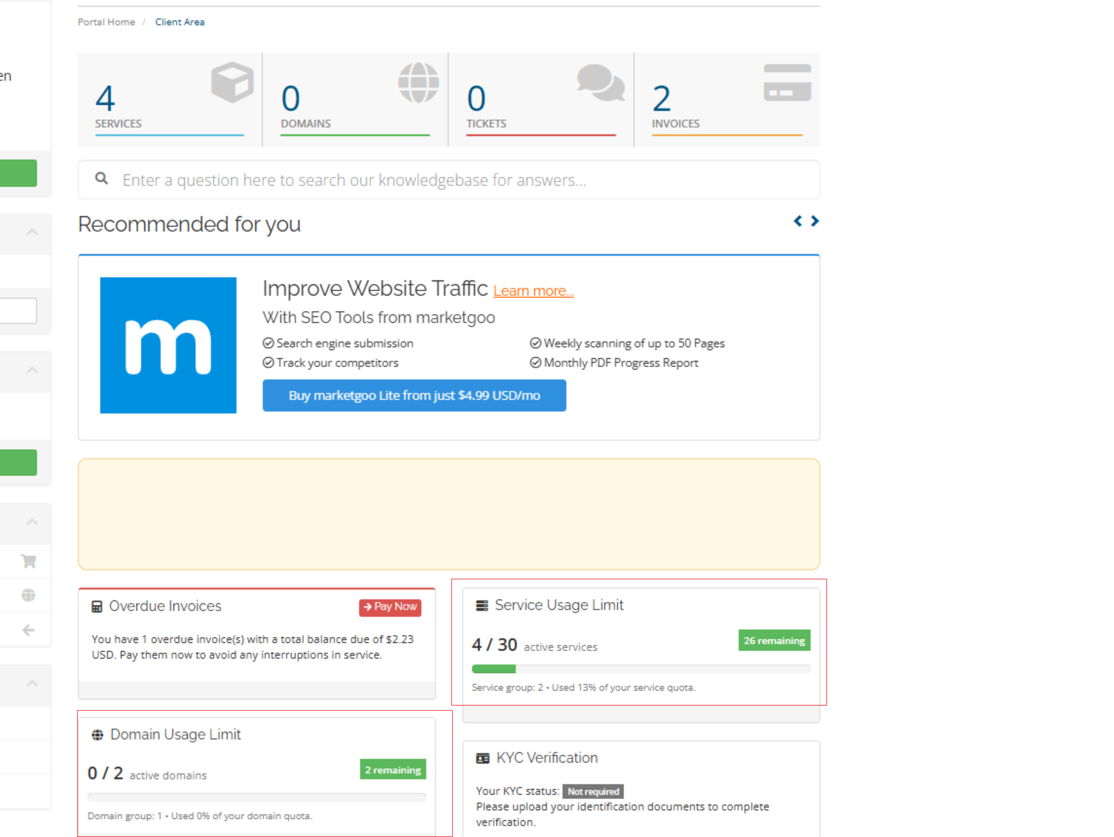 Define and enforce limits on the number of services, products, and domains a client can have, separated by categories and item types.