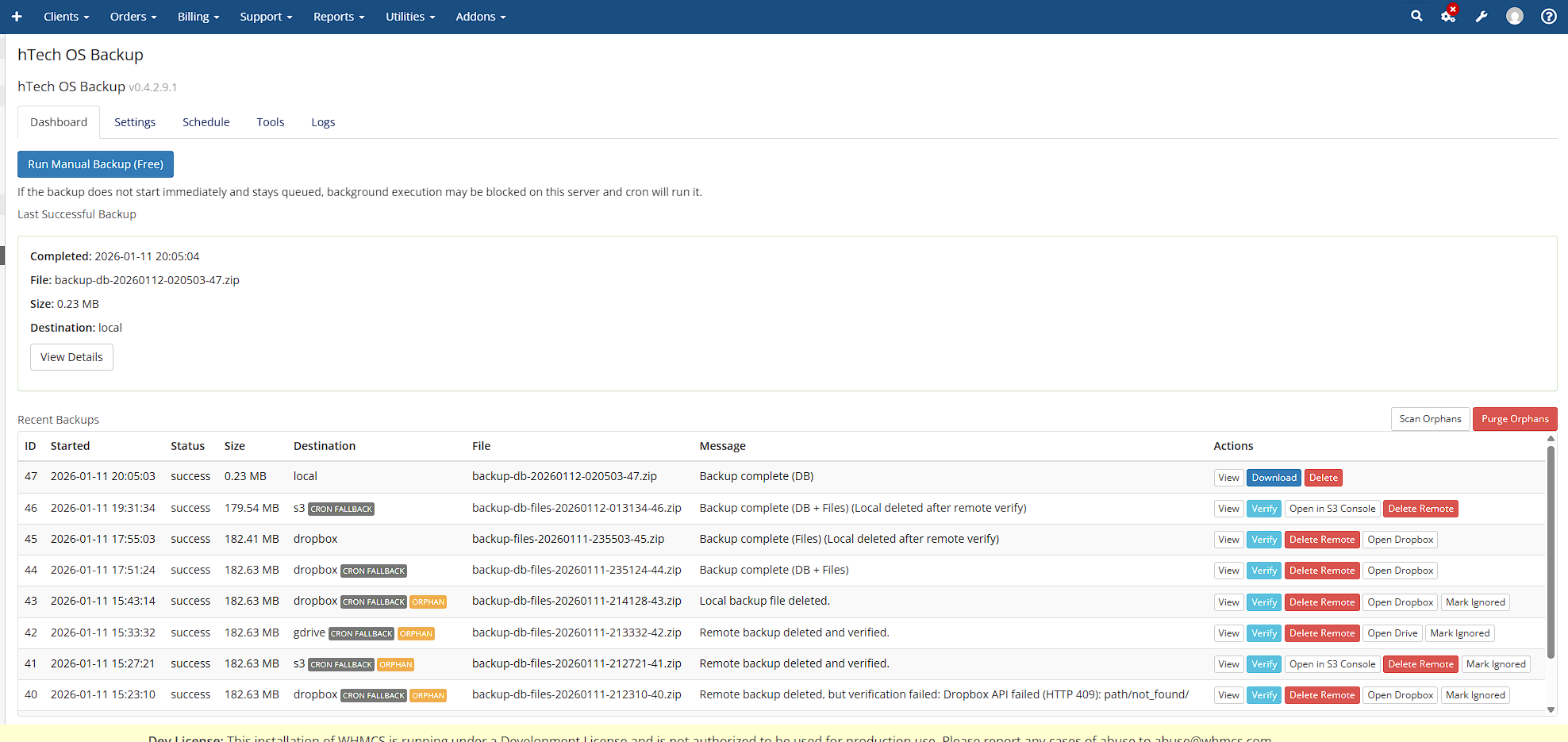 The module is built with WHMCS 8.x best practices, defensive coding standards, and long-term maintainability in mind. It supports both manual backups (free tier) and automated scheduled backups (paid tier), allowing providers to scale usage as their needs grow.