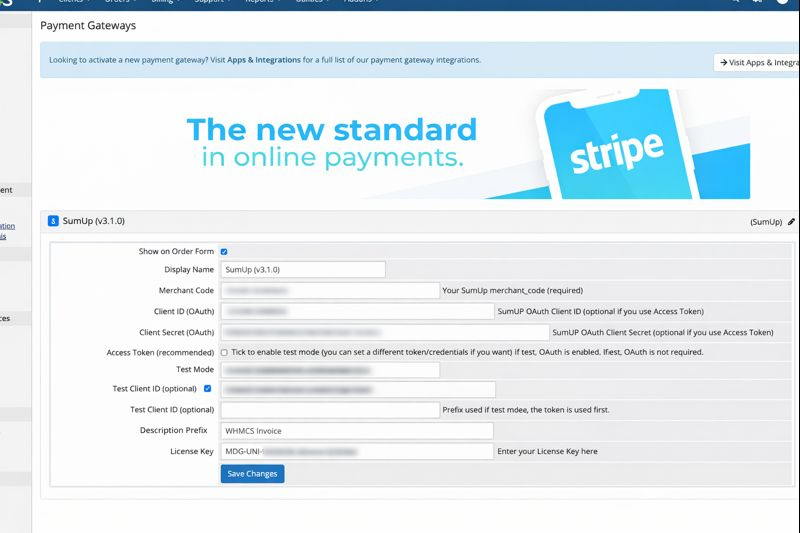 Key Features Accept credit and debit card payments via SumUp Hosted checkout (secure redirect) Multi-currency support with automatic conversion Test mode and production mode Automatic invoice payment confirmation Supports OAuth or Access Token authentication Compatible with modern WHMCS versions No core file modifications required