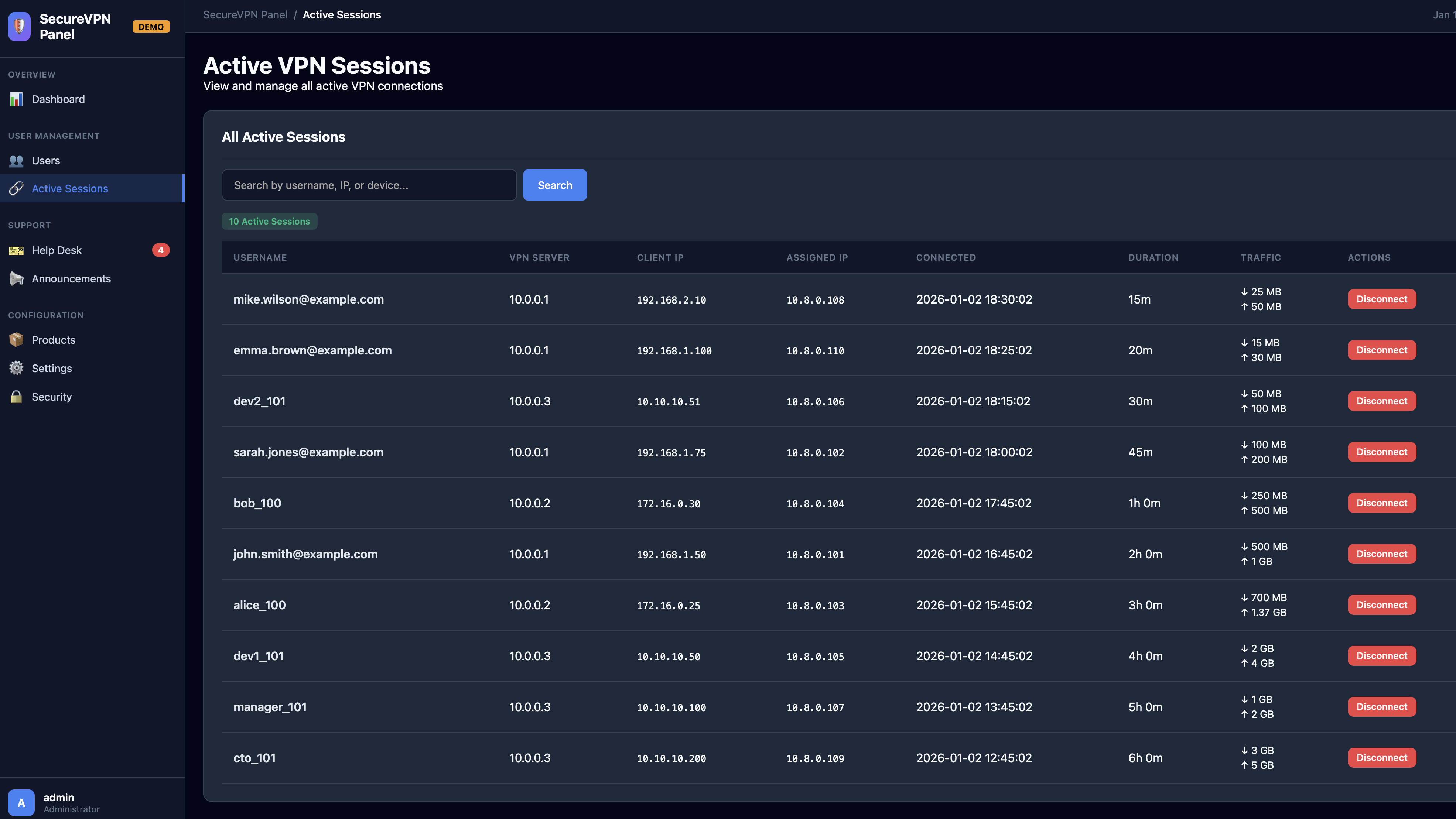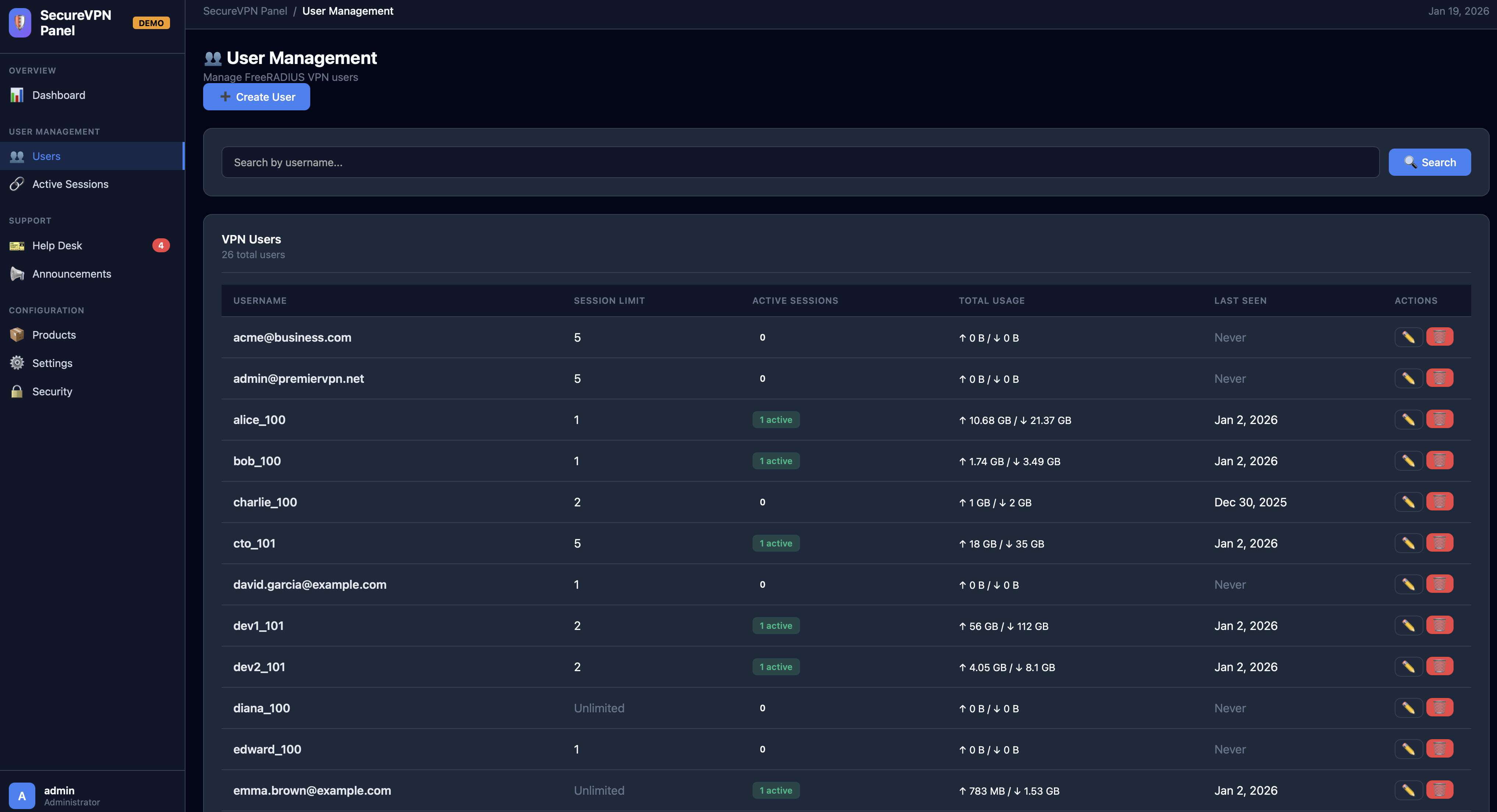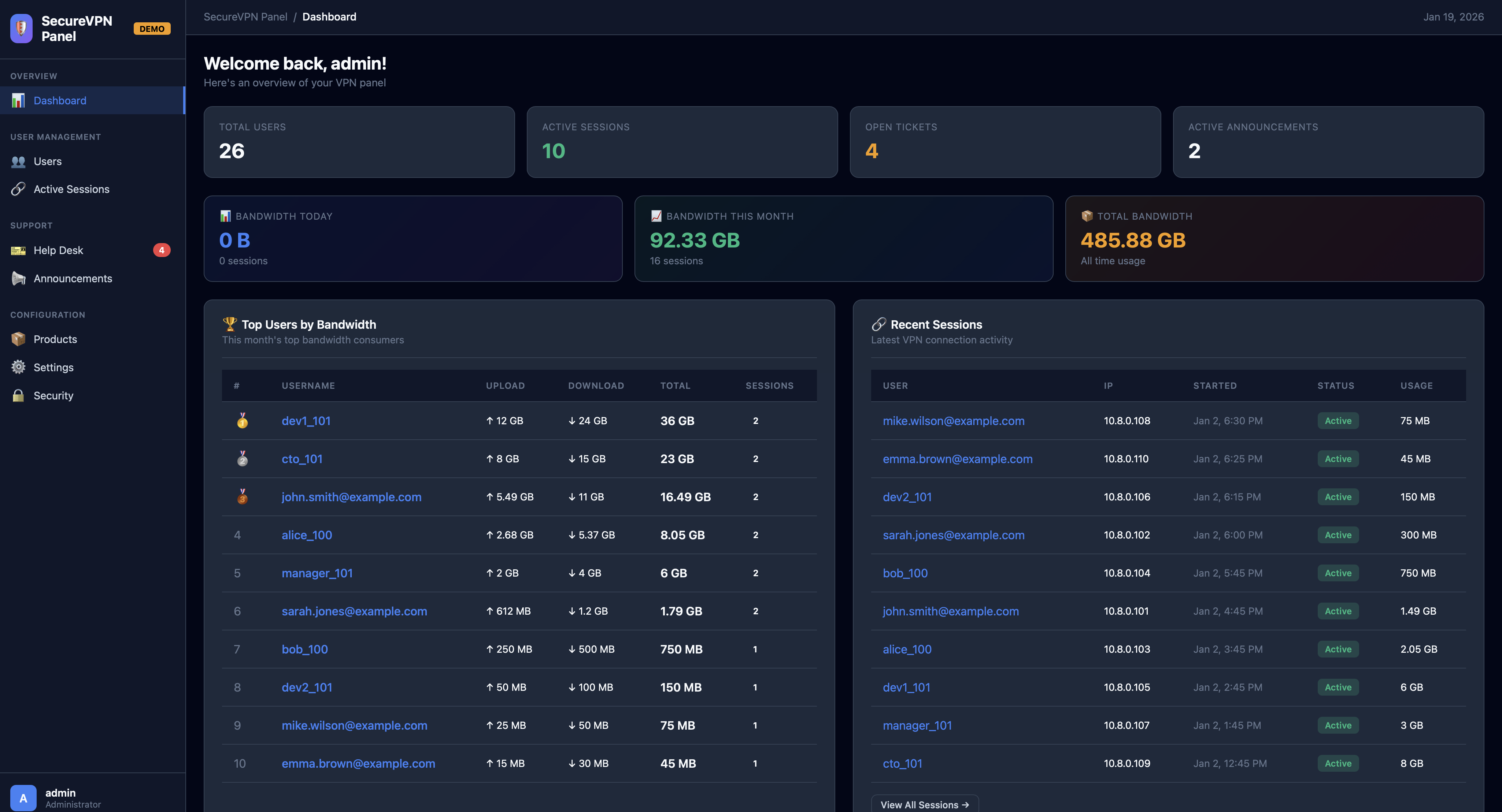 VPN Panel is a comprehensive management solution that bridges WHMCS with FreeRADIUS, enabling VPN providers and ISPs to automate their entire service delivery workflow. Instead of building custom integration from scratch, you get a complete, production-ready platform that handles everything from account provisioning to customer support.