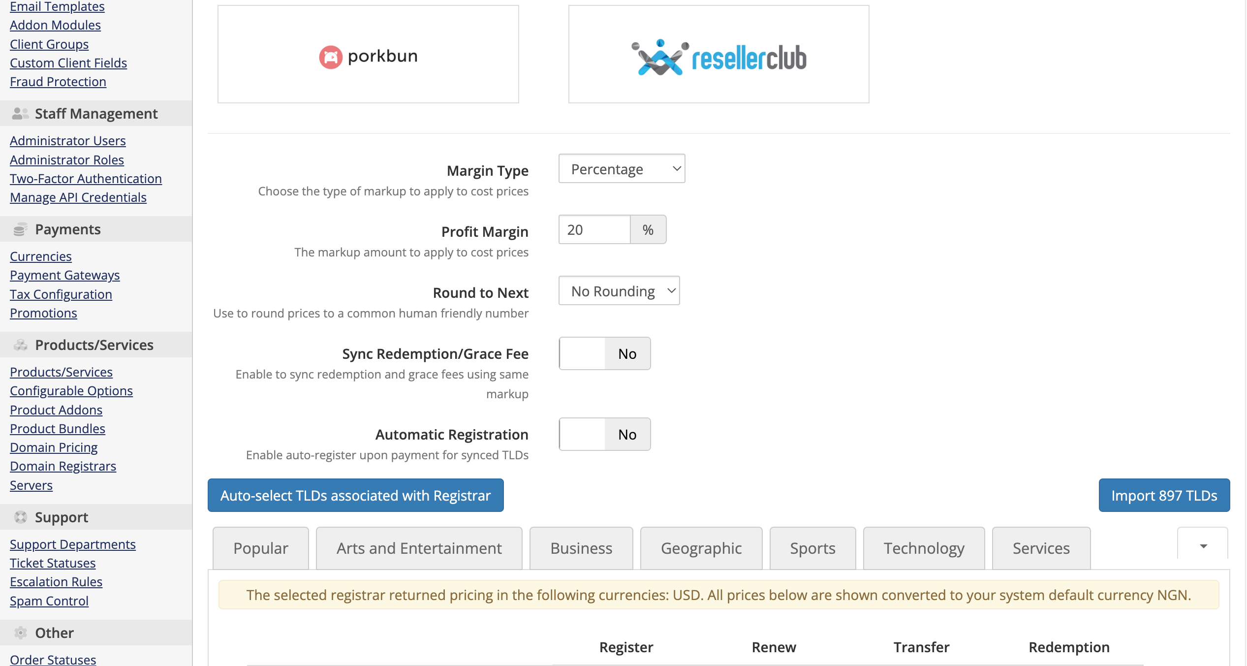 This module integrates Porkbun domain registrar with WHMCS, allowing automated domain registration, DNS management, nameserver updates, URL forwarding, and TLD price import with profit margin support.