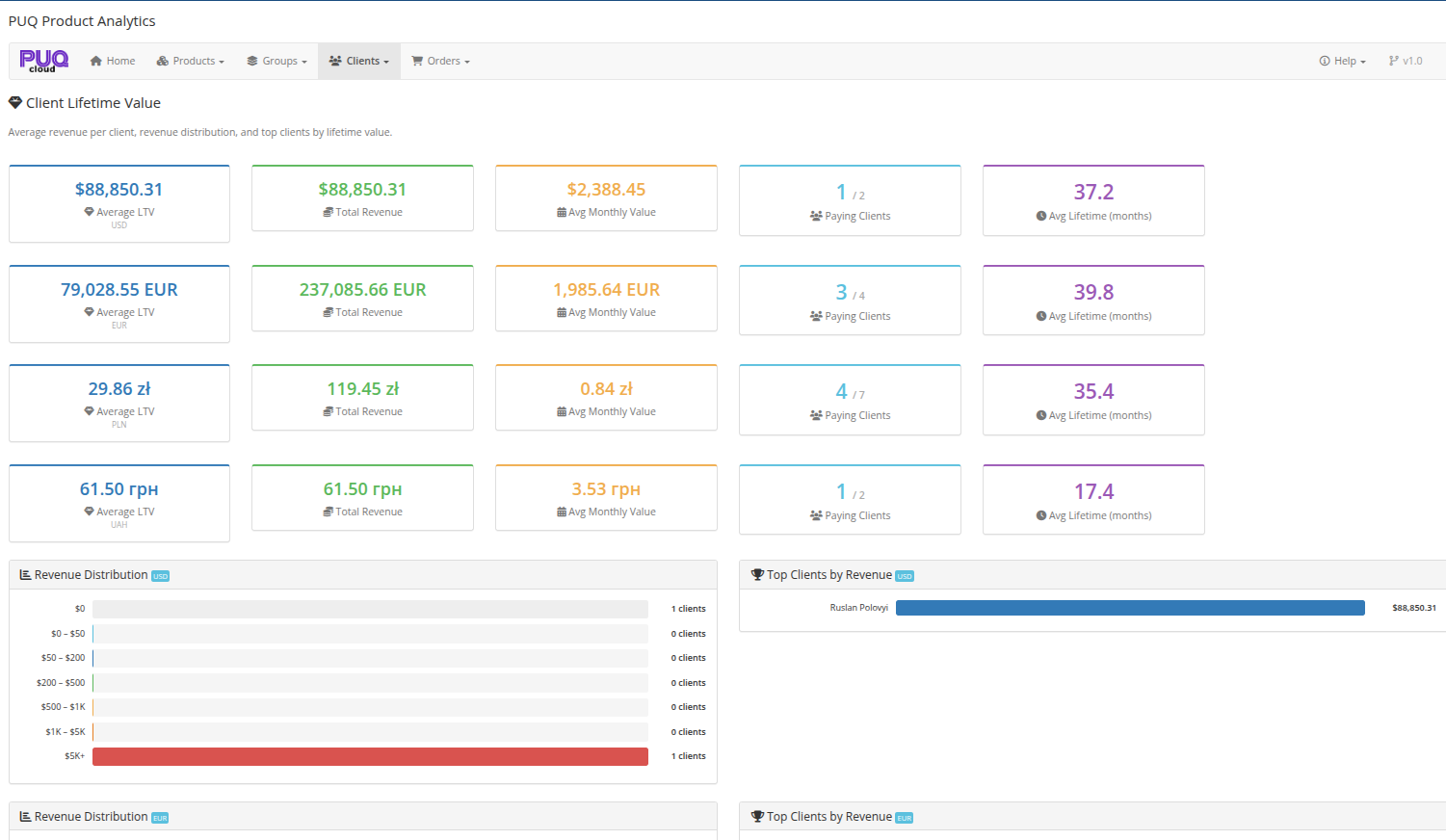 You get dedicated analytics pages inside WHMCS: a dashboard overview, product and group reports, client revenue & LTV views, and order analytics. Every section includes fast search, sorting, and date range filters to analyze performance for specific periods.