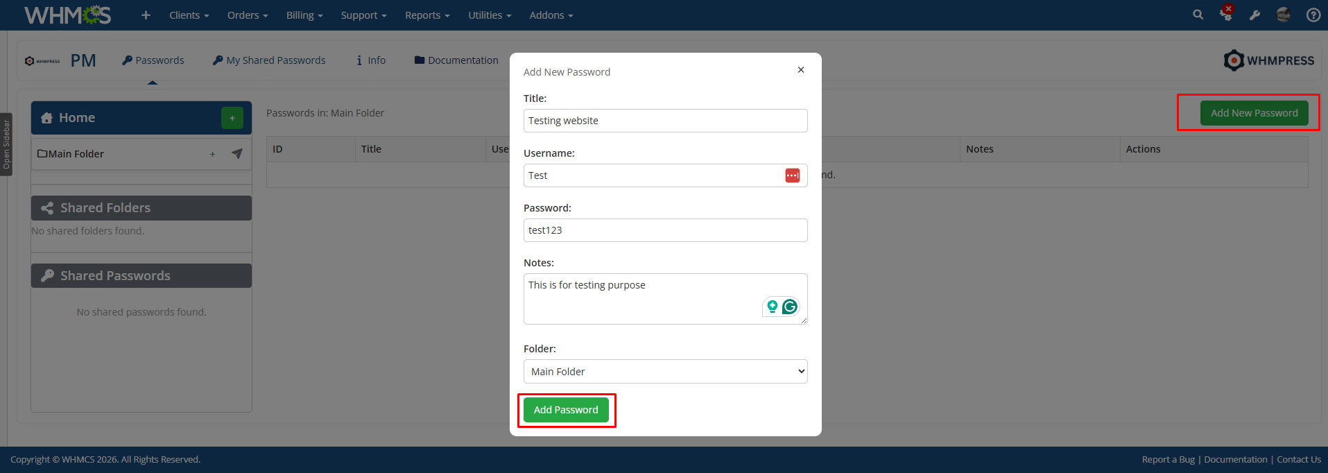 WHMPRESS Password Manager for WHMCS is a secure credential management solution designed to help administrators safely store and organize sensitive information, including passwords, license keys, and private notes. The module allows you to create main folders and subfolders for the structured management of credentials.