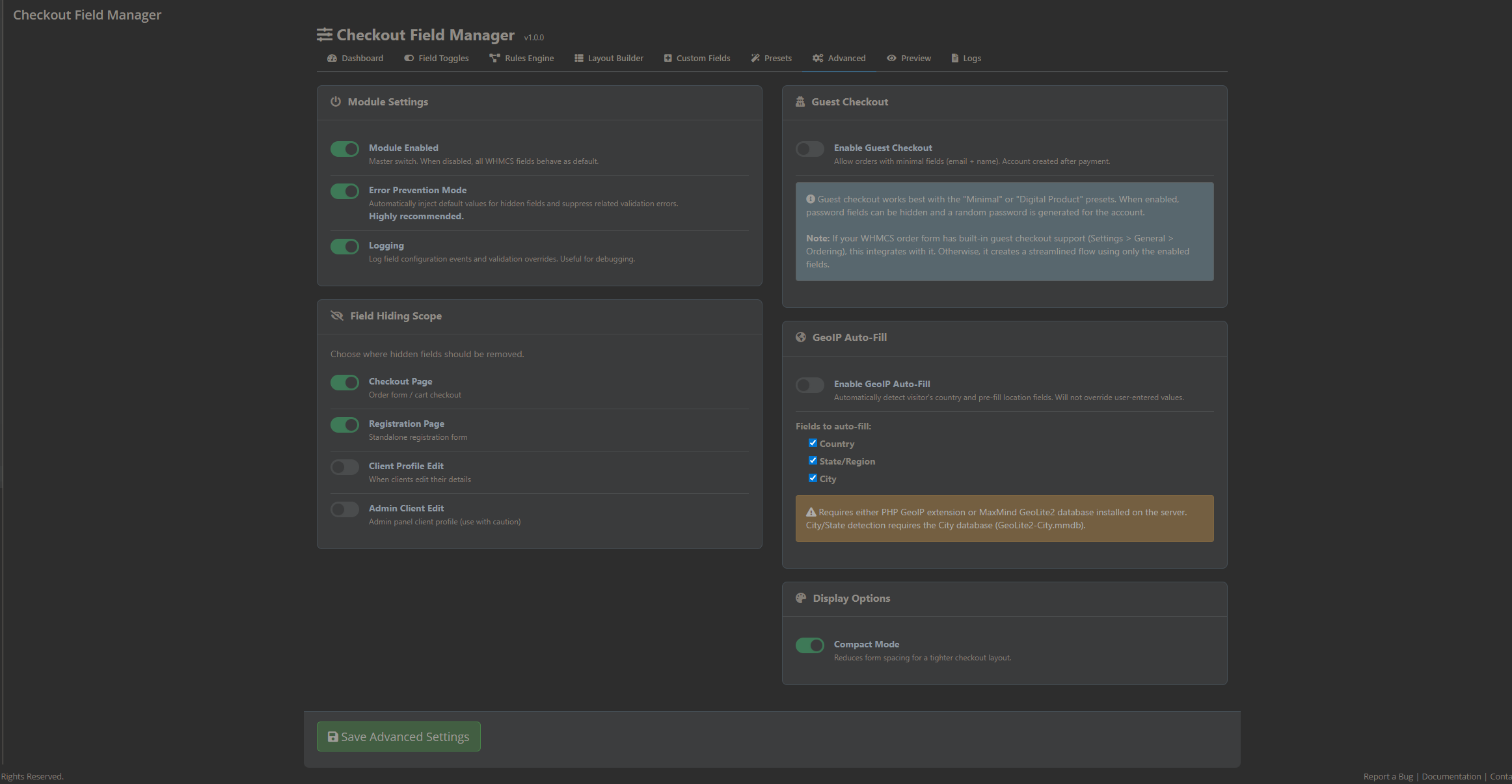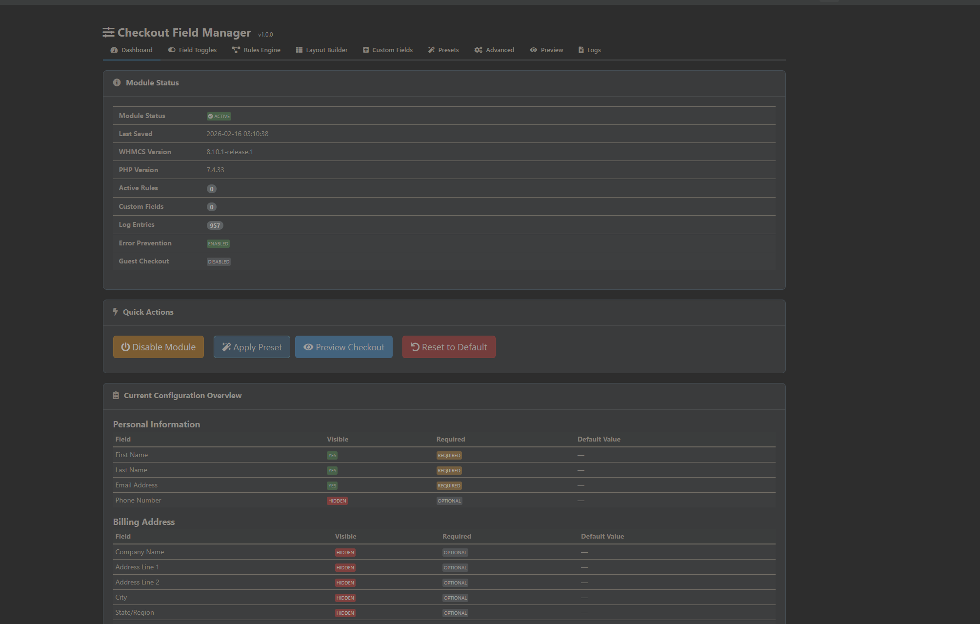 Checkout Field Manager gives you the ability to dynamically control, validate, require, hide, and customize checkout fields based on products, product groups, client groups, and country logic — all without modifying core files.