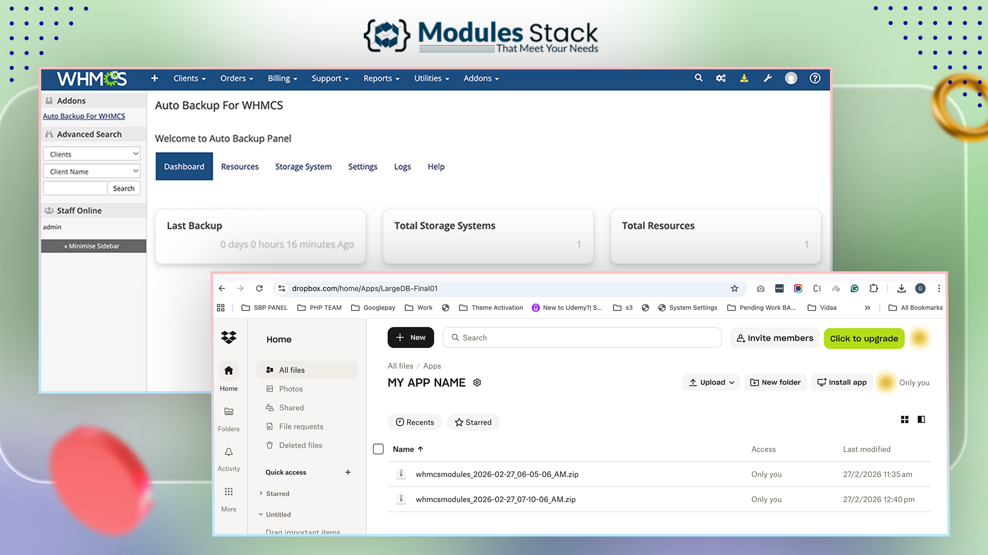 The Auto Backup For WHMCS module provides a complete and reliable backup automation solution to safeguard your WHMCS installation. It enables automatic backups of your WHMCS files, MySQL database, or both at scheduled intervals and securely stores them in your connected cloud storage.
