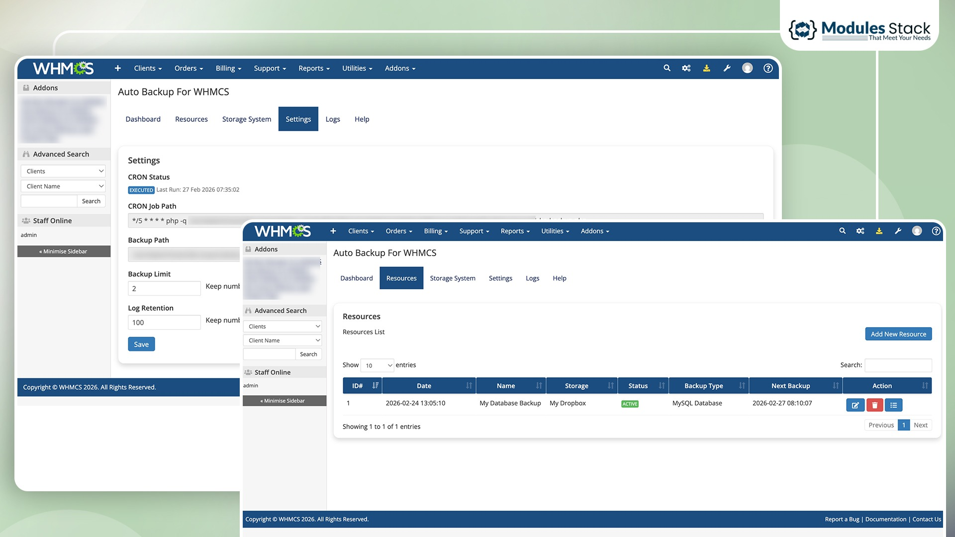 Unlike manual backup methods that are time-consuming and prone to human error, this module ensures your critical billing data, client information, and system files are consistently protected through automated cron-based execution. With flexible resource-based configuration, you can define what to back up, when to run backups, and where to store them — giving you full control over your data protection strategy.