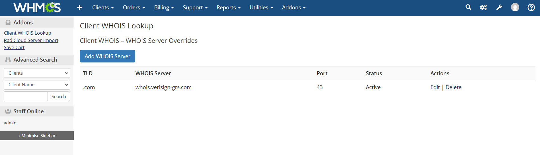 WHMCS Admin → Addons → Client WHOIS Lookup