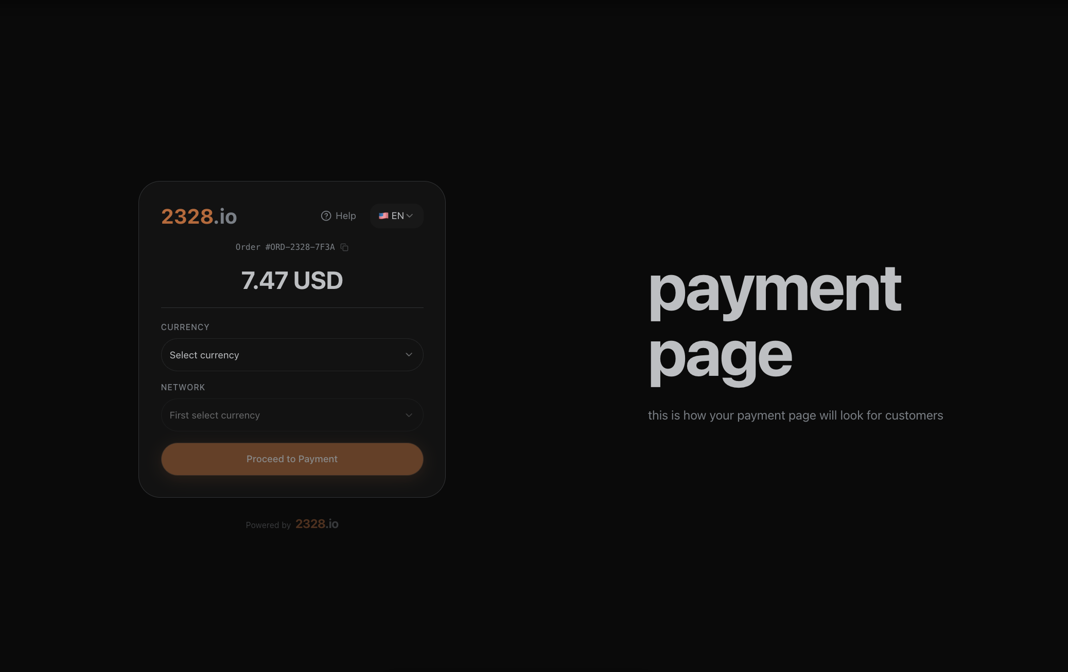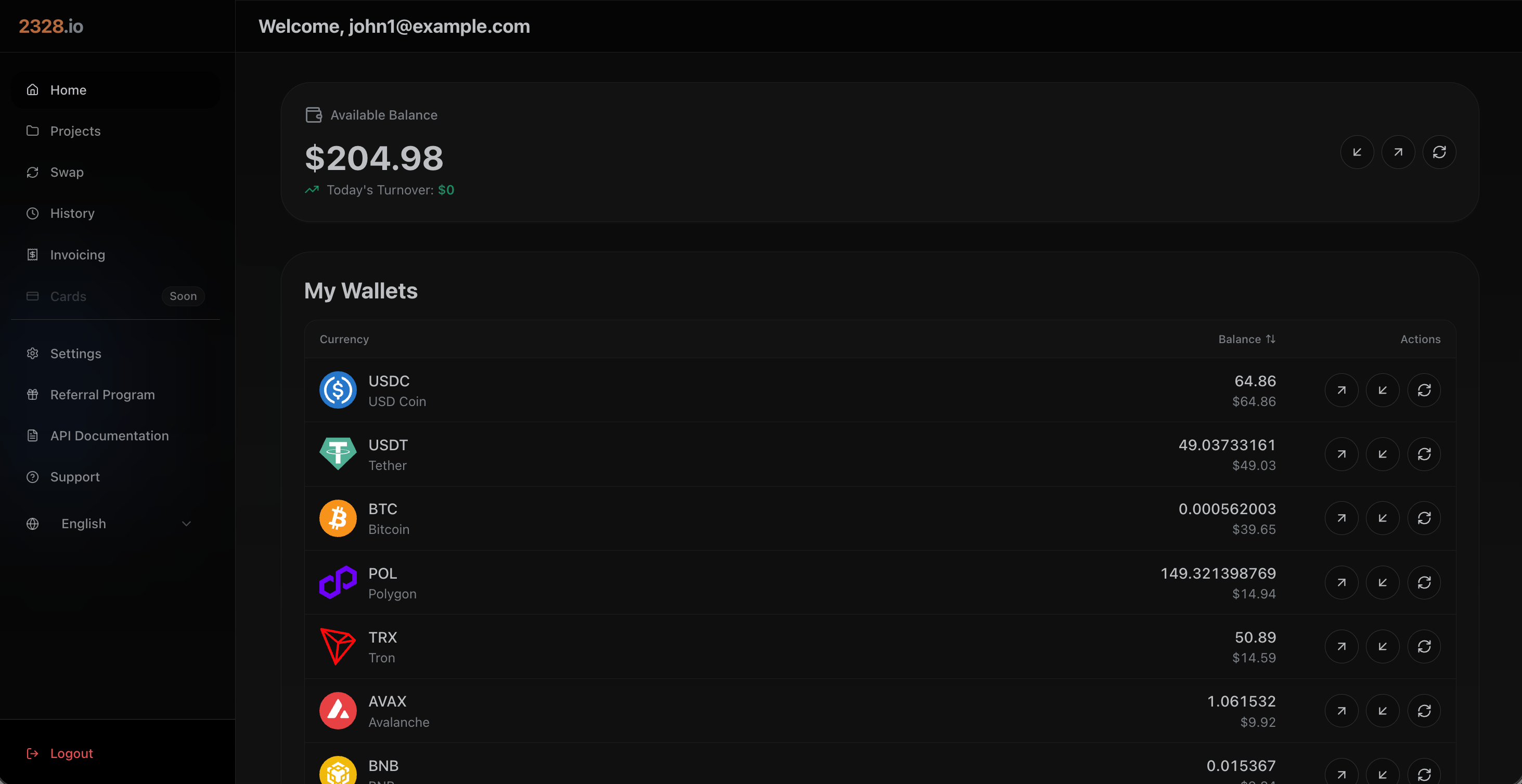 Built for hosting providers, SaaS platforms and digital services, 2328 delivers reliable crypto payment processing with stablecoin settlement and automated financial control.