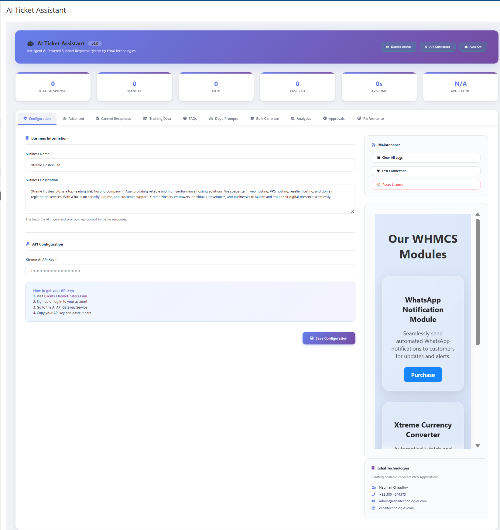 Install & Configure — Upload the module, enter your API key and license key (Can get from https://clients.xtremehosters.com), and configure your business details