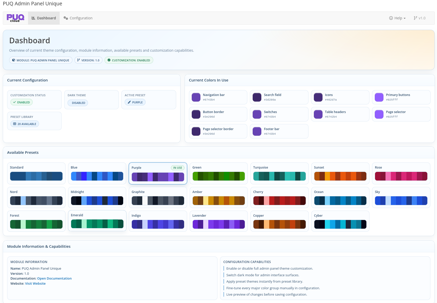 The module also includes a dedicated dashboard that shows the current configuration state, including customization status, dark mode status, active preset, current colors in use, preset library count, and module information. The save process includes CSRF protection, HEX color validation, and a safe post-redirect-get workflow to prevent duplicate submissions.