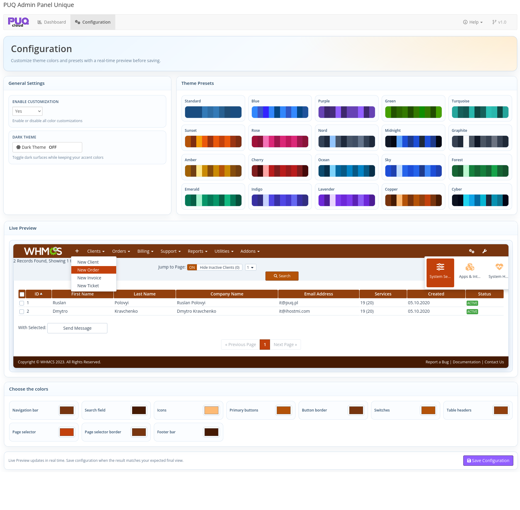 PUQ Admin Panel Unique lets you change the visual style of the WHMCS admin interface from one place. The module includes a card-based configuration page where you can enable or disable customization globally, switch dark theme surfaces on or off, apply one of the built-in presets, or manually adjust key interface colors to match your branding and working preferences.
