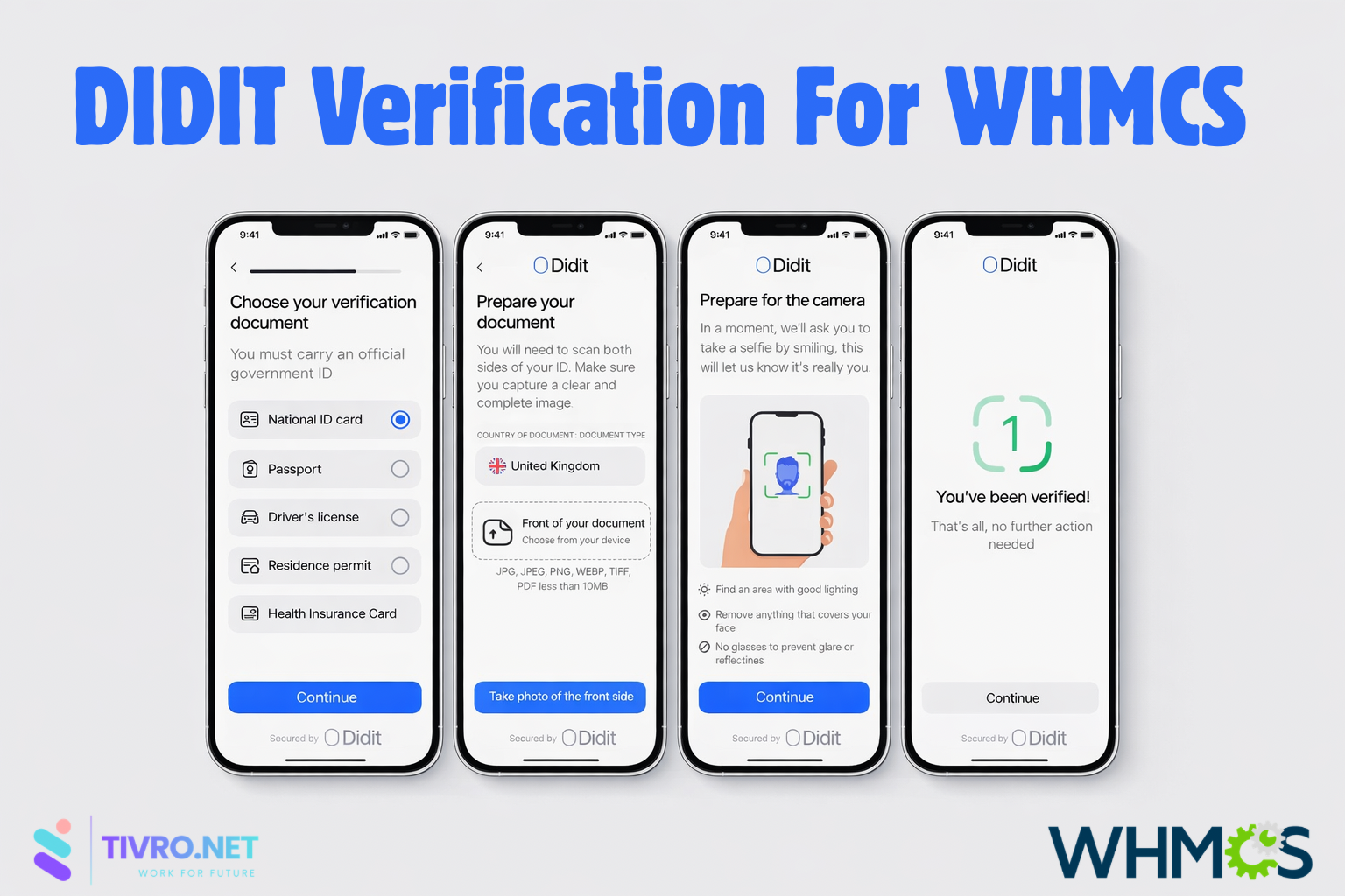 Didit KYC Verification for WHMCS brings enterprise-grade identity verification to your hosting portal in minutes. Powered by Didit, clients complete government ID checks and selfie biometric verification inside a secure popup — they never leave your WHMCS portal.