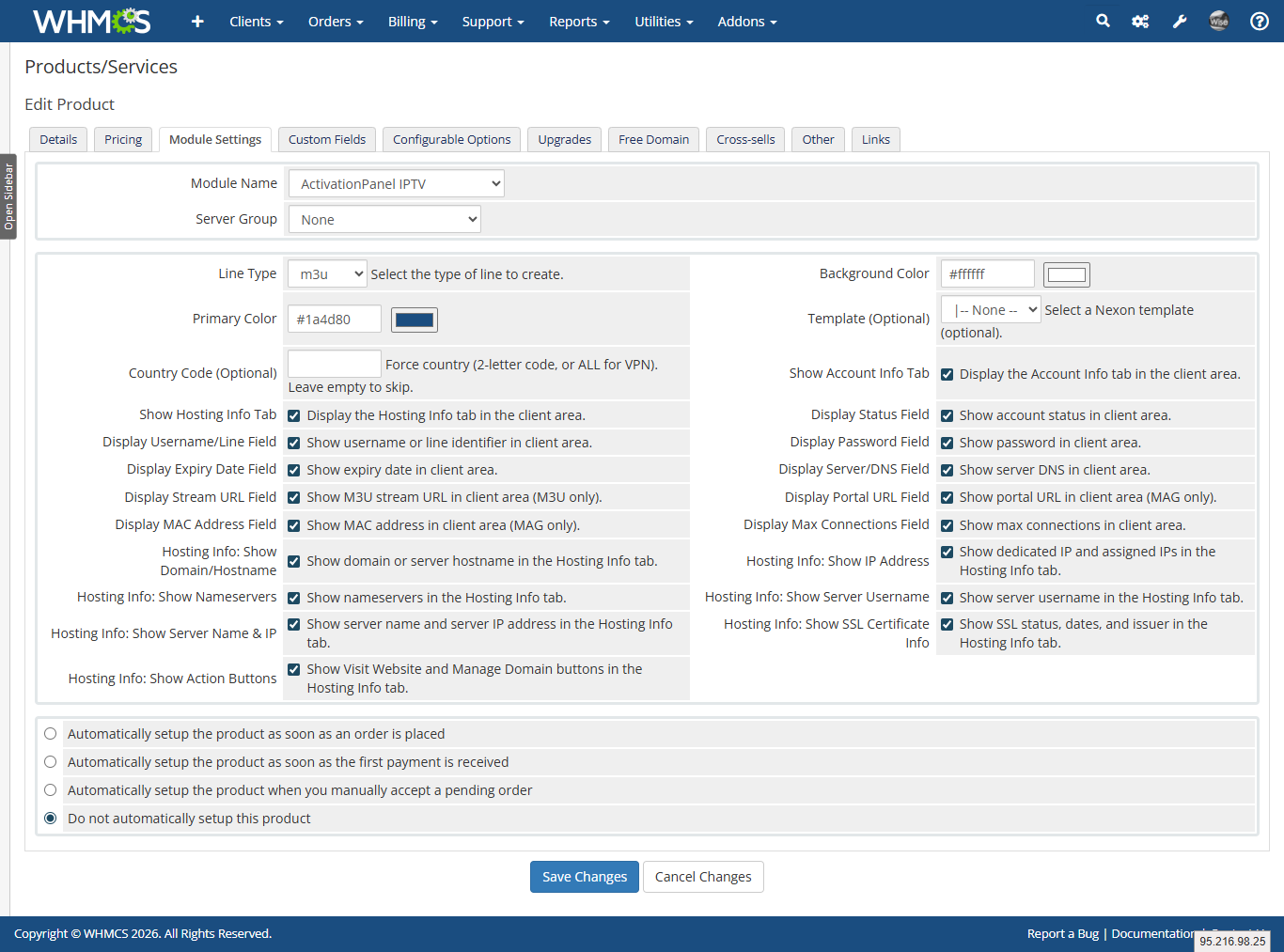 TestConnection via Reseller Info API CreateAccount supporting M3U, MAG, and Code line types RenewAccount (Extend) for all line types ChangePackage (Extend to new package) for all line types SuspendAccount / UnsuspendAccount / TerminateAccount stubs Admin Services Tab showing live account info from API Client Area with per-product customisable primary/secondary colours Per-field visibility toggles in ConfigOptions Password show/hide toggle and copy-to-clipboard in the client area Automatic table creation (whmp_nx_service_extras) on first use