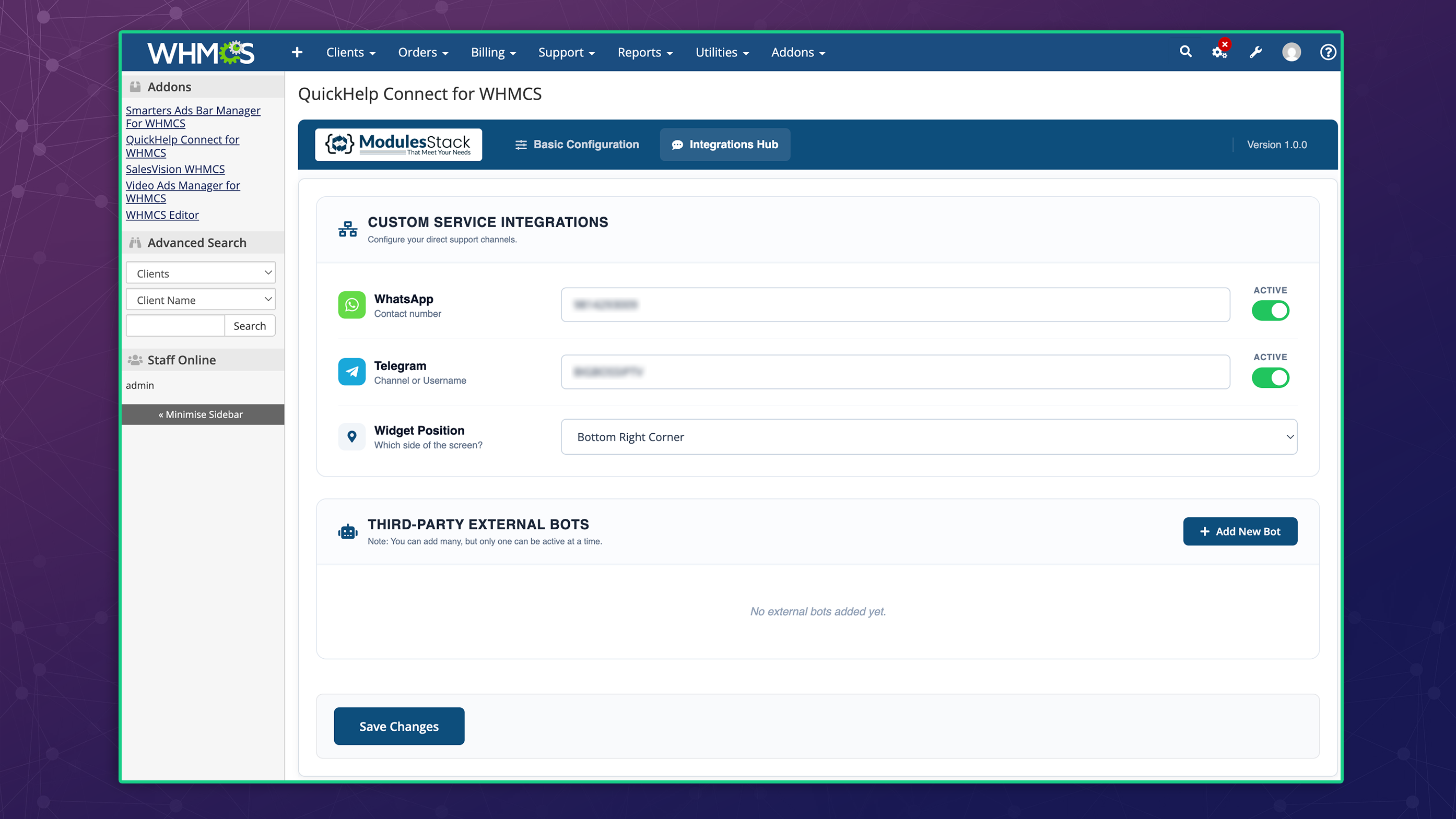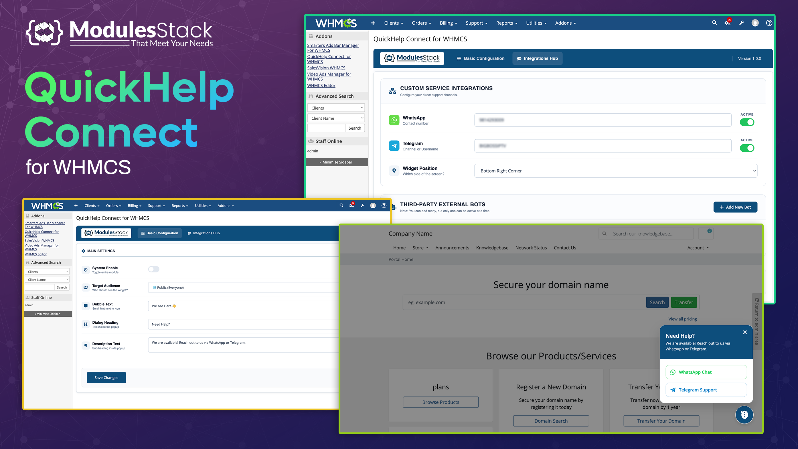 QuickHelp Connect for WHMCS is a powerful communication module designed to enhance your client support experience by integrating instant messaging directly into your WHMCS client area. With just a single click, your clients can connect with you via WhatsApp, Telegram, or a custom chatbot — making support faster, more accessible, and more efficient.