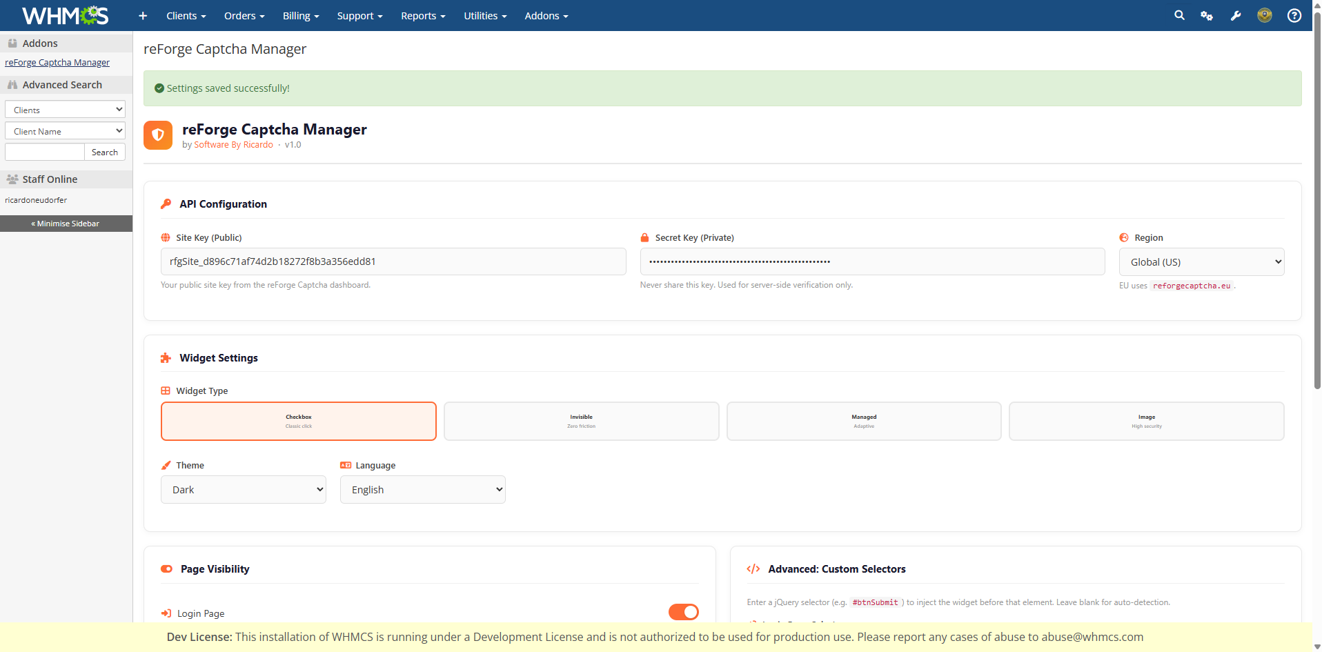 <head> of the page on any enabled page.<div class="reforge-captcha"> is injected into the form just before the submit button.reforge-captcha-token input into the form./api/verify) and checks that success is true and score >= 0.5.https://yourwhmcsinstallation.tld/youradminpath/configaddonmods.php