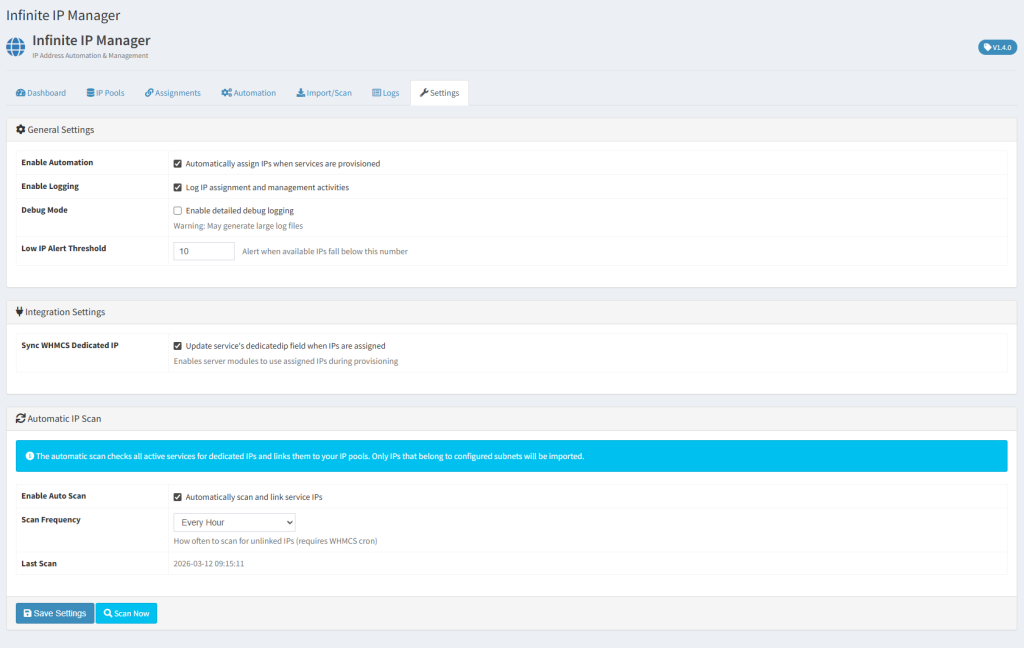 - Automation rules per product and addon with configurable IP counts