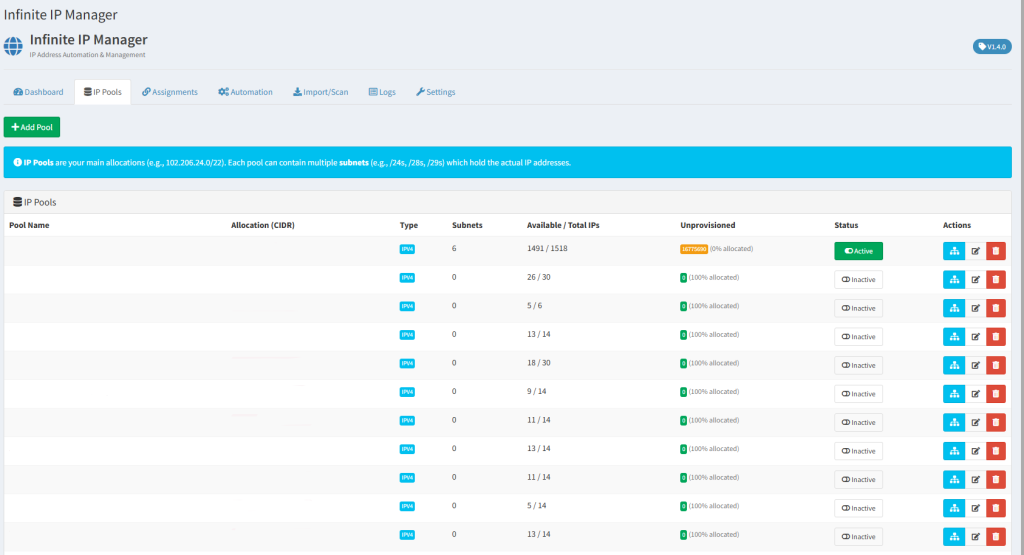 - Pool and subnet management with hierarchical organization (pools → subnets)