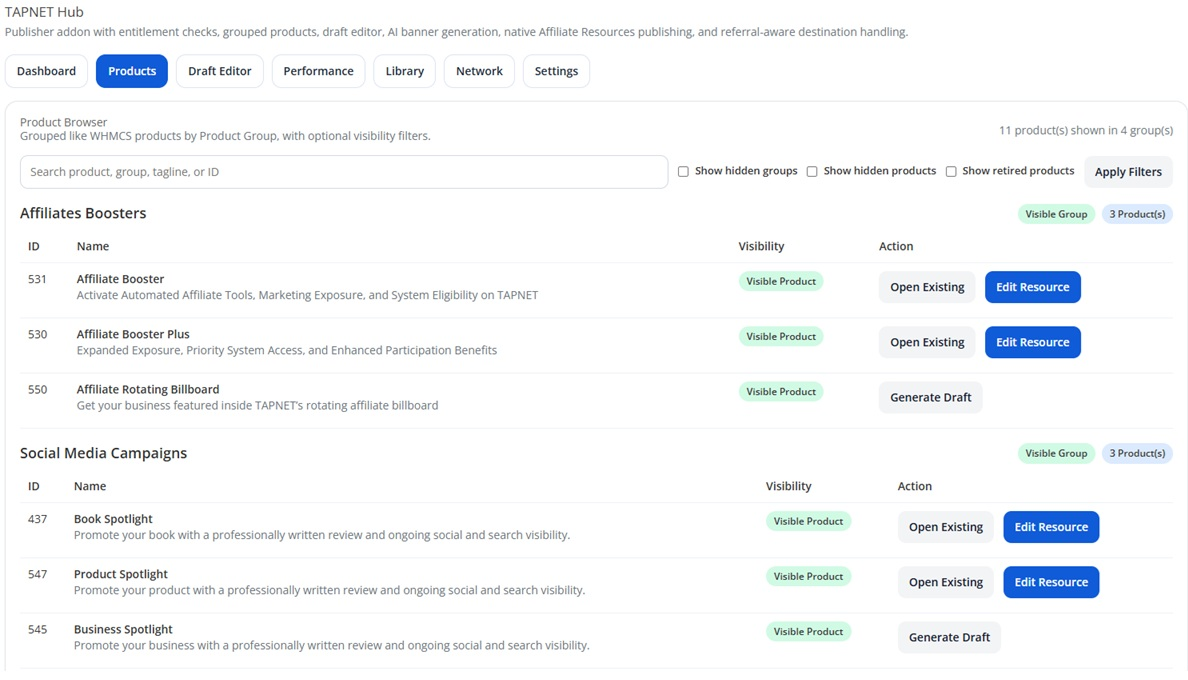 All synced directly into the Affiliate Resources addon with Hub-managed control and protection.