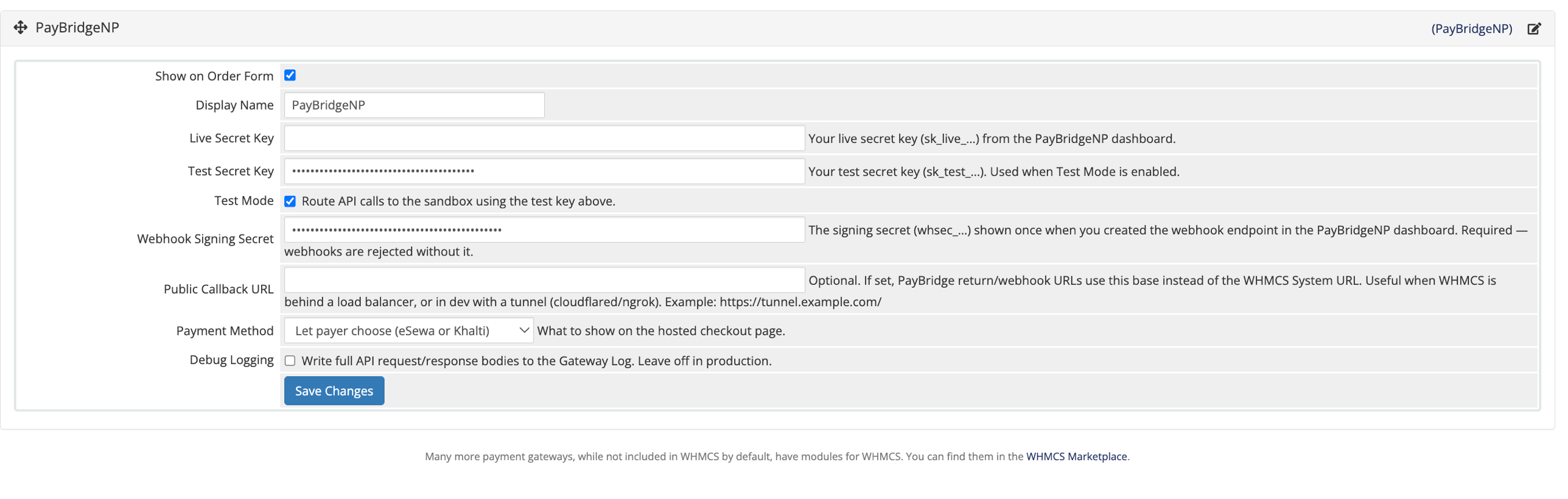 PayBridgeNP is a payment aggregator for Nepal. Install this module once and your customers can pay WHMCS invoices with eSewa, Khalti, and any future method PayBridgeNP adds - no second configuration, no second reconciliation, no duplicate webhook endpoints.